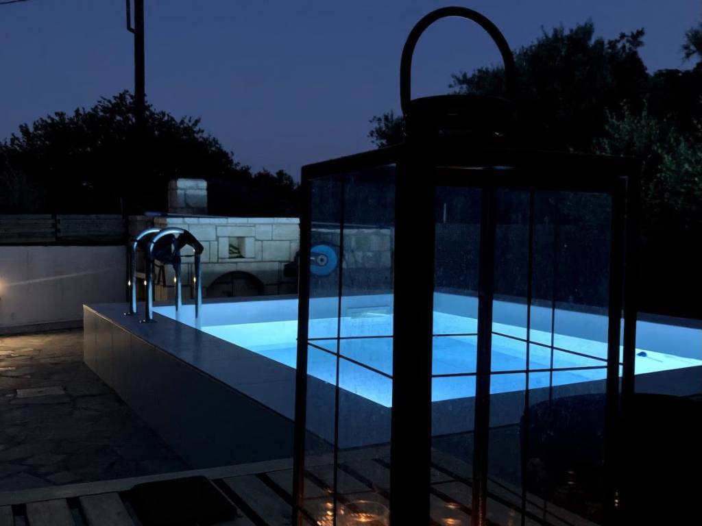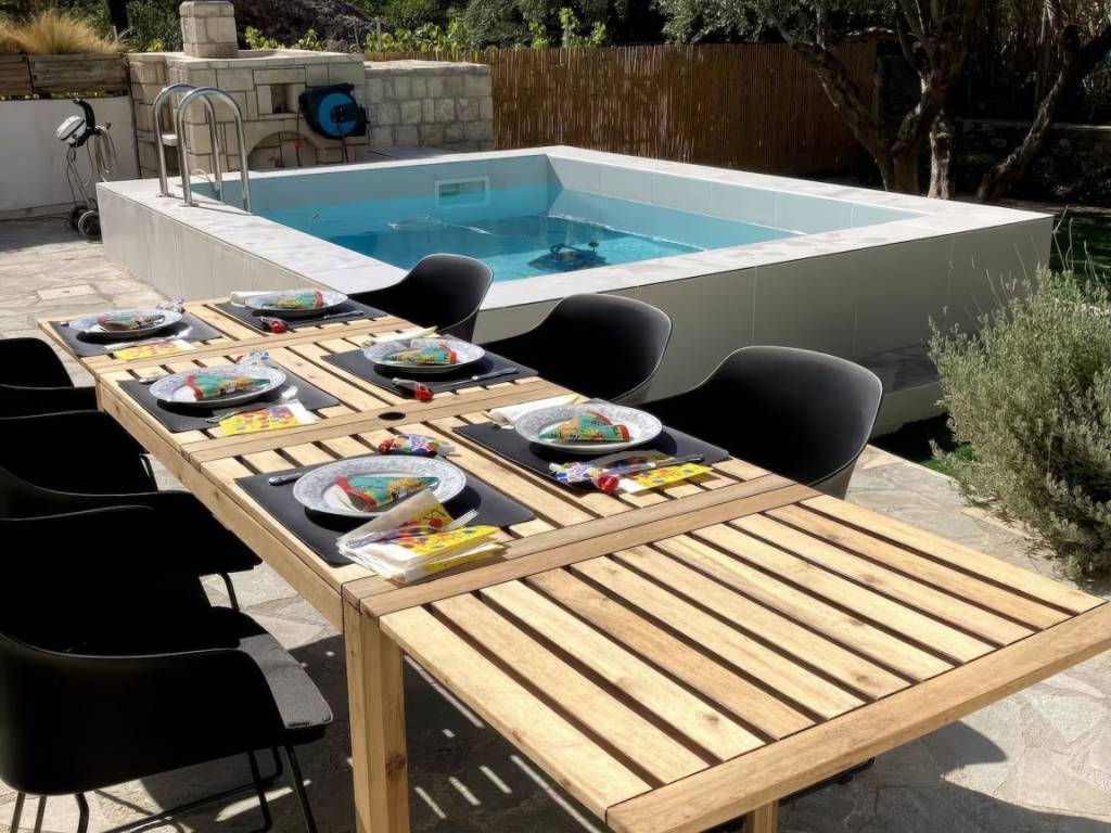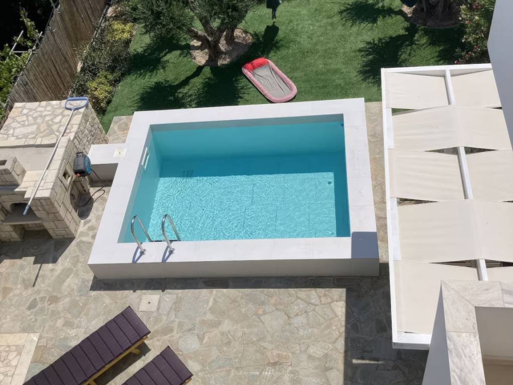 The outdoor area of the villa centers on a 3x4 m saltwater swimming pool that is fully automatic, and a spacious lounge deck, creating an ideal setting for relaxation and entertaining. It is further enhanced by a landscaped garden, several shaded seating areas, and a jacuzzi, creating a private and inviting environment for enjoying the Mediterranean lifestyle, while the stone oven caters for the al-fresco experience.
