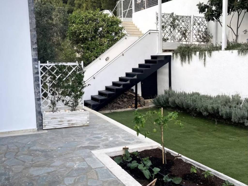 The top floor is dedicated to the master bedroom, which includes an en-suite bathroom and a workspace, ideal for remote work or quiet relaxation. From here, a spacious terrace offers beautiful sea views, providing the perfect setting to unwind and enjoy the surroundings.