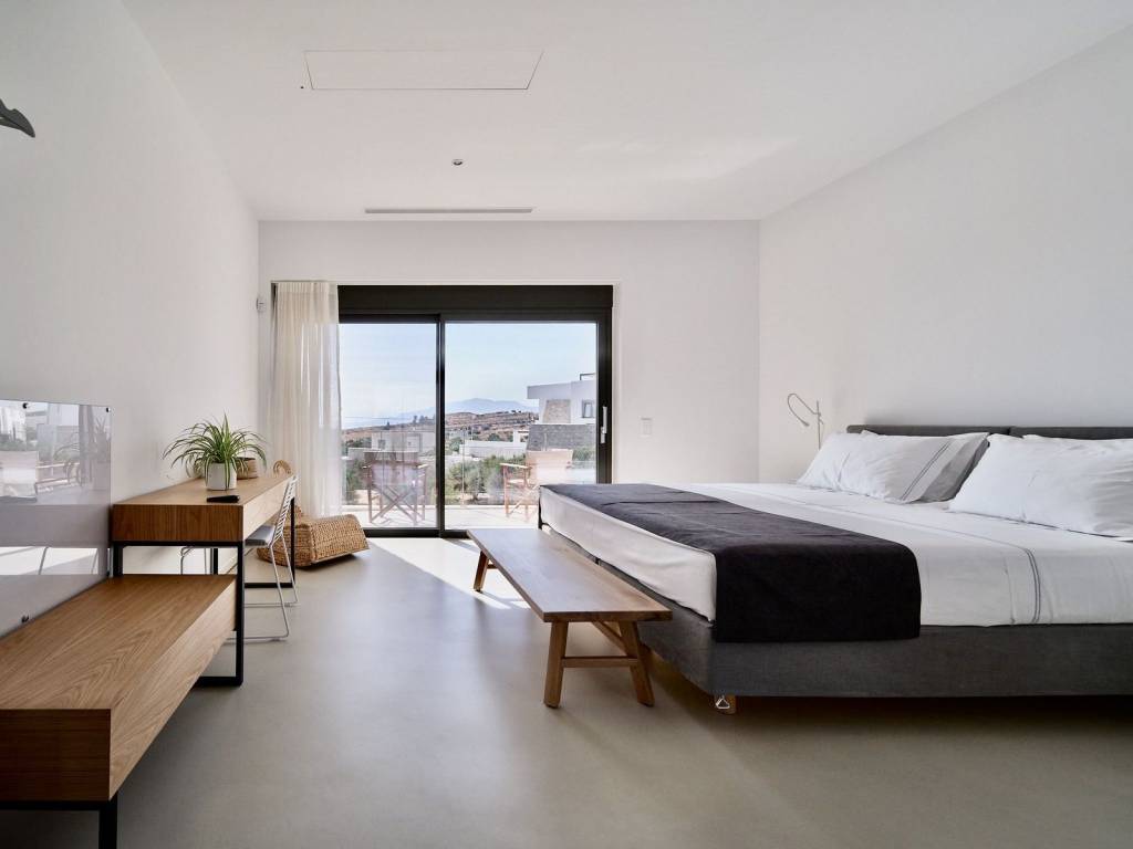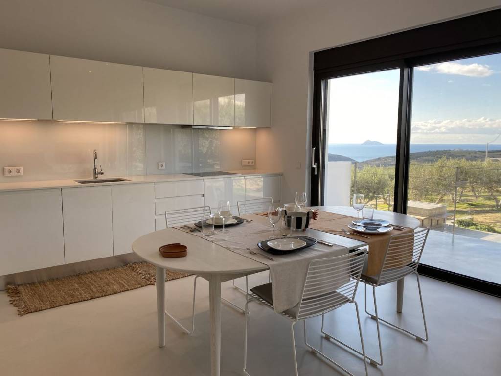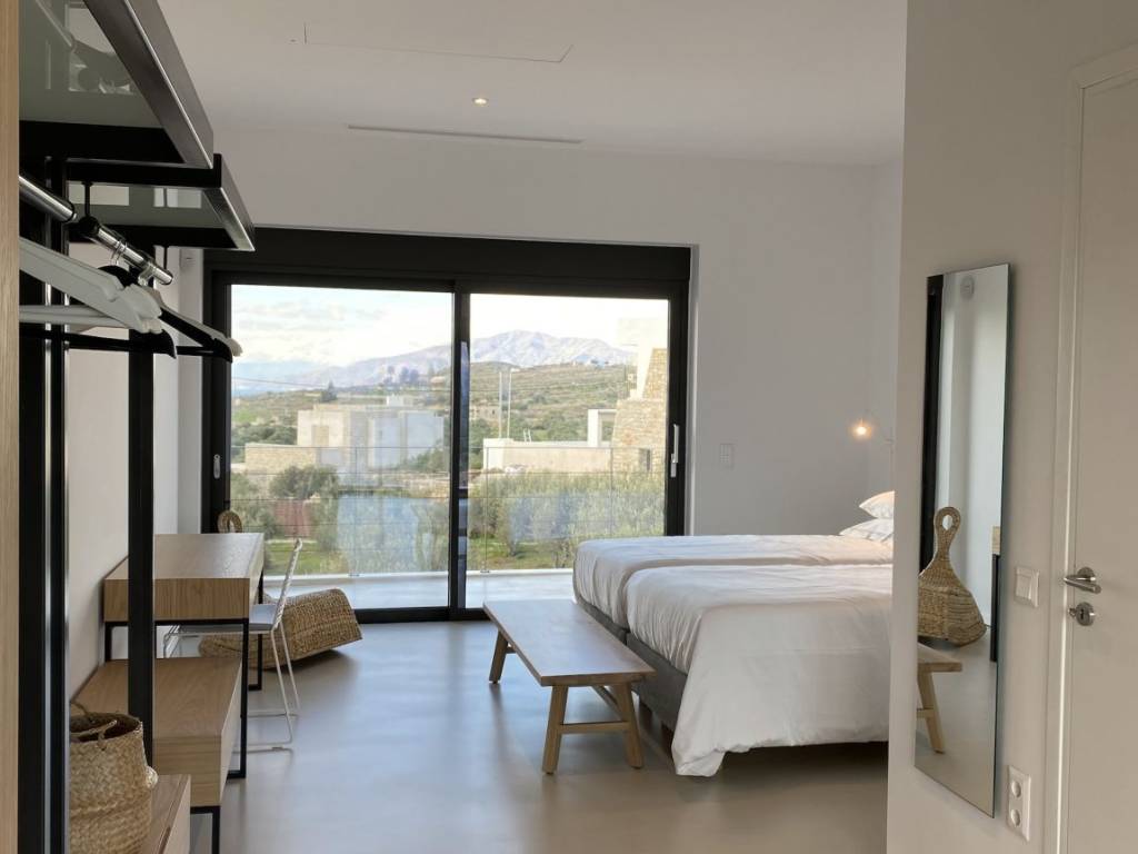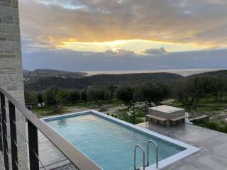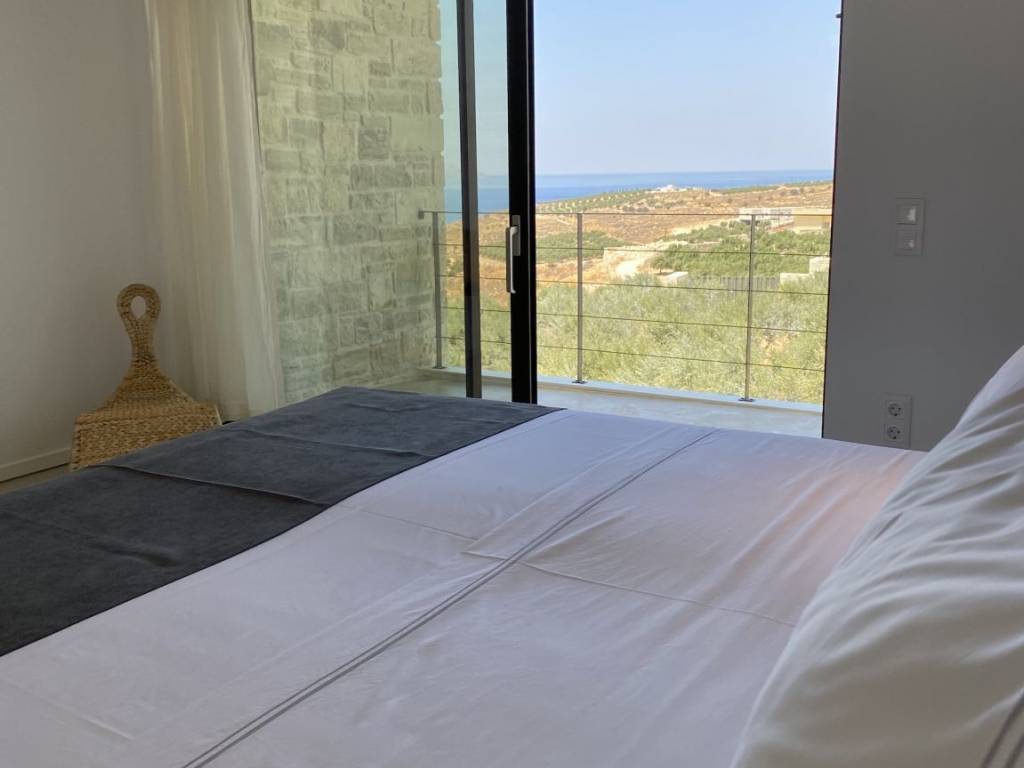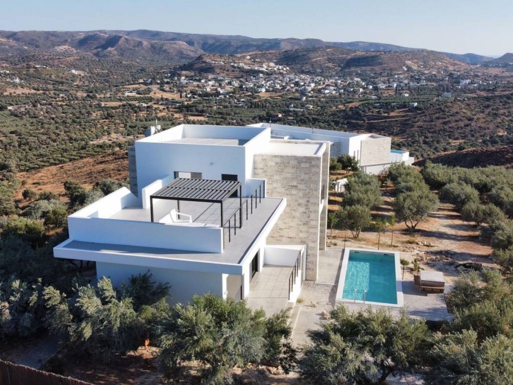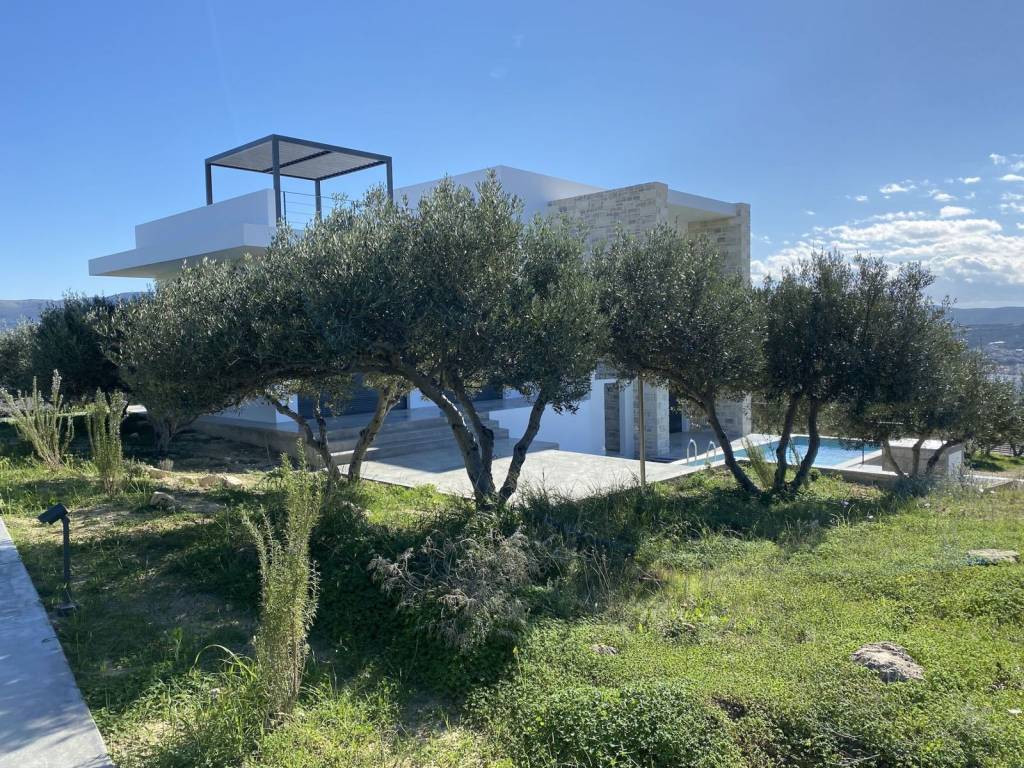 Set against the scenic backdrop of Kamilari, Heraklion - Crete, lies a contemporary villa, completed in 2021. Offering panoramic views of the sea, the charming Cretan landscape, and the sunset, this modern villa is equipped with top-notch amenities such as photovoltaic panels, 24-hour automatic ventilation, a heat pump, underfloor heating, and fan coils for cooling. Covering 157 sqm within a 2000 sqm plot, this residence features two bedrooms, two bathrooms, and an open-plan living room, offering contemporary comforts amidst its natural surroundings. As an added value, the plot features 50 productive olive trees, enhancing the beauty of the landscape and giving you the opportunity to produce your own olive oil.Inside, you'll find a high-quality Italian open-plan kitchen complete with Miele appliances, including a washing machine. Outdoors, a sizable 22 sqm swimming pool awaits. At the rear of the house, an external staircase leads to a terrace providing wide views of the sea, the plains of Messara, the Psiloritis mountain range, and the Asterousia Mountains.