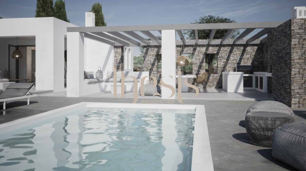 Outdoors, the property reveals its true character. A private swimming pool of 50 sq.m. with an outdoor bathroom becomes the focal point of daily living, surrounded by generous lounging and dining areas. The BBQ setting and outdoor dining space invite long, unhurried gatherings, where afternoons dissolve into evenings under the Cycladic sky.