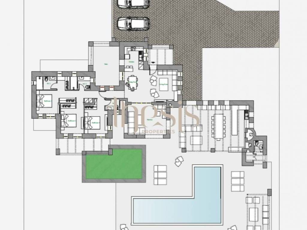 The villa hosts three bedrooms and three bathrooms, thoughtfully arranged to offer both autonomy and fluidity. Each space is positioned to capture light, openness, and a sense of calm, while maintaining a discreet separation that allows for effortless hosting.