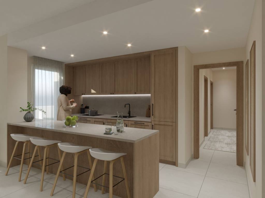 Newly built apartment with a total surface of 113 sq.m. in a modern residential complex next to the sea. The property offers excellent layout, utilizing every square meter, featuring: open-plan kitchen area, spacious living room, three bedrooms and two bathrooms. The kitchen is spacious with plenty of storage space and is separated from the living room by a kitchen island, which can also be used as a dining table. The apartment features large windows and balcony doors, allowing ample natural light to flood in throughout the day, leading to comfortable and spacious balconies. Additionally, separate storage rooms and underground parking spaces are provided in the basement. A unique solution for anyone looking for a newly built apartment within walking distance from the city of Corfu.