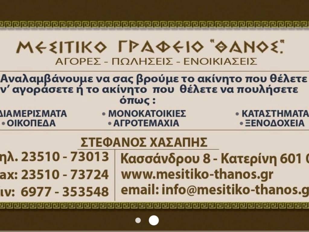 Πωλείται 63 τμ. Ισογειο Κατάστημα - Μισθωμένο 300 ευρώ το μήνα. Και 54 τμ. Γκαρσονιέρα 1 όροφος με μίσθωμα 220 Ευρώ. Βρίσκεται στο κέντρο της Κατερινης κοντά στην Πλατεία. Το γραφείο μας δραστηριοποιείται στις αγοραπωλησίες και μισθώσεις επαγγελματικών και οικιστικών ακινήτων καθώς και οικοπέδων εντός του νομού Πιερίας, με συνέπεια και αποτελεσματικότητα. Αποτελούμε μια ξεχωριστή παρουσία στον χώρο των μεσιτικών συναλλαγών και μαζί με τους συνεργάτες μας θα βρούμε το ιδανικό ακίνητο ακόμα και στον πιο απαιτητικό αγοραστή. Εκτός από τα ακίνητα που υπάρχουν στην ιστοσελίδα μας διαθέτουμε και αρκετά άλλα τα οποία όταν επικοινωνήσετε με το γραφείο μας θα σας ενημερώσουμε λεπτομερώς για τα στοιχεία του διαμερίσματος, οικοπέδου ή και επαγγελματικού χώρου που εσείς θέλετε. Μέσα από την ιστοσελίδα μας θα δείτε όμορφα τοπία του νομού μας και επίσης θα βρείτε χρήσιμες πληροφορίες που θα σας βοηθήσουν και θας σας καθοδηγήσουν ως προς την απόκτηση, πώληση ή ενοίκιαση του ακινήτου σας. www.mesitiko-thanos.gr