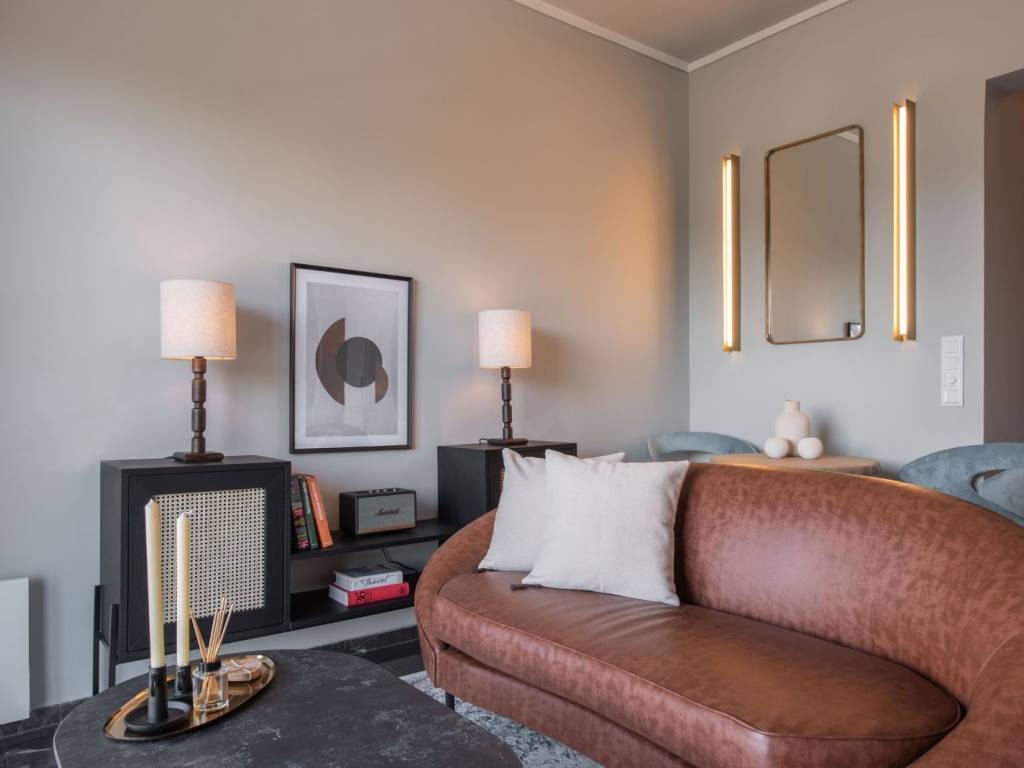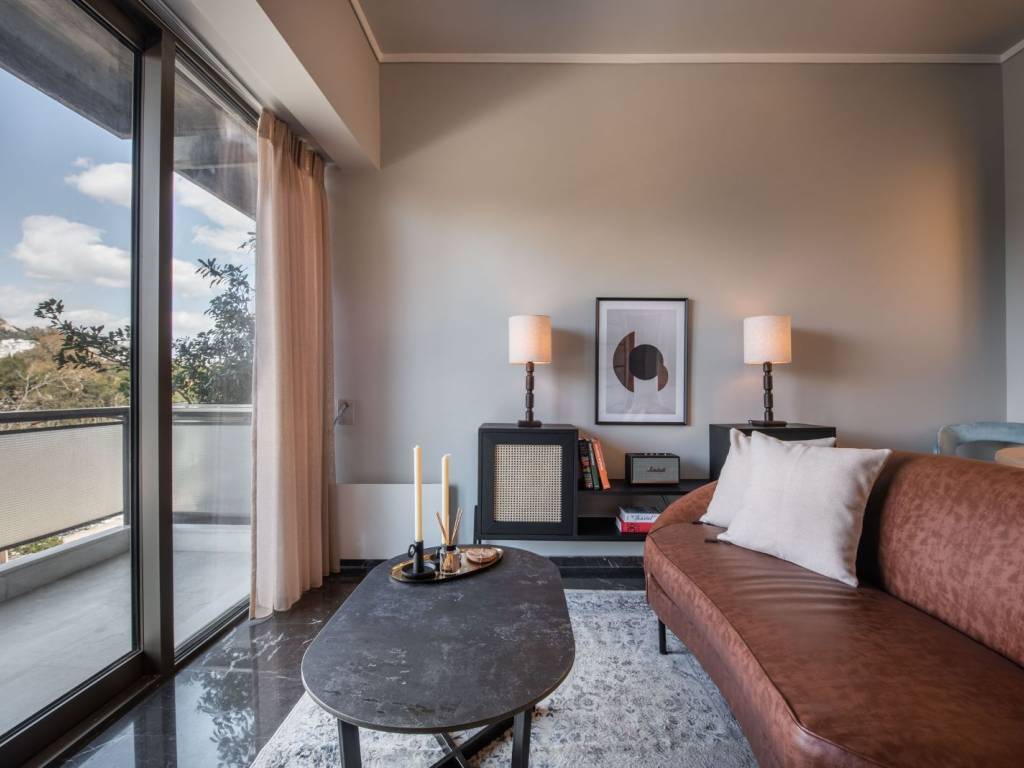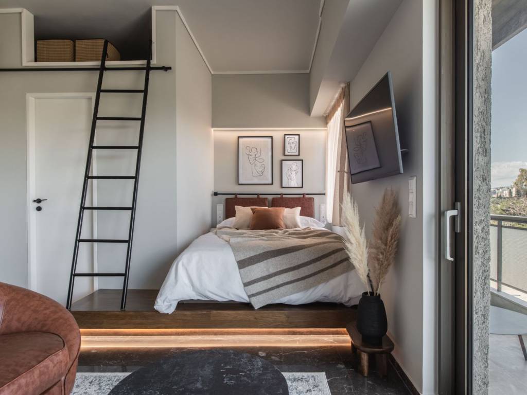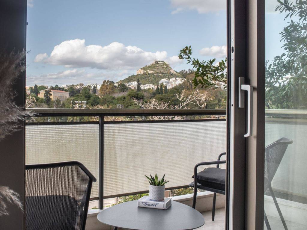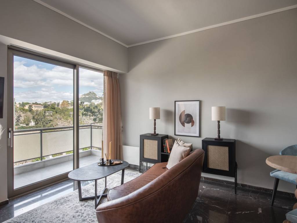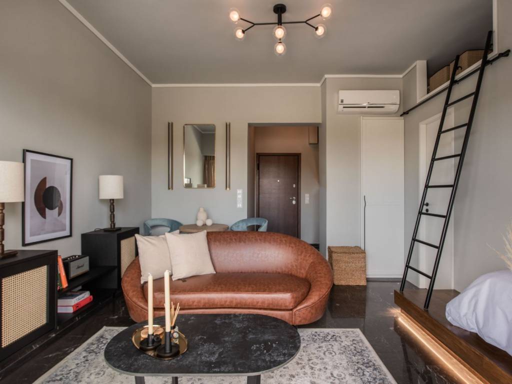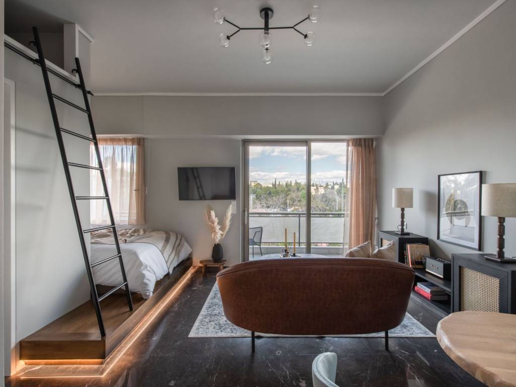 Neo-retro style apartment in a hip neighborhood of the city center just steps away from the Panathenaic Stadium (Kalimarmaro) and access to all public transportation. The property features an open space design with a bedroom, living and dining area, a fully equipped kitchen, a bathroom, and a balcony with unobstructed city views (Lycabettous Hill, Zappeion, partial view to Akropolis). The space: Every aesthetic detail along with the overall layout have been purposefully chosen to create a cozy and modern living space following neo-retro tones that contribute to the ultimate home experience for long and short stays alike. Its open-space floorplan has an elevated nook with a large double-sized bed and a window directly next to it for ample sunlight and incredible views of the park/stadium directly from the bedroom. The living area offers a leather sofa, a flat screen TV and a cozy dining are looking towards the balcony wall-to-wall window slide-door that leads to the outdoor terrace where lounge furniture allows you to relax and enjoy your morning coffee while looking at the city views and Mt. Lycabettus. Its fully equipped kitchen is separated from the living area and features a rolling library ladder for convenience. A second rolling library ladder can be found next to the bedroom area so you can access its floor-to-ceiling closet space with ease. Our guests can expect all modern amenities available to them for a lavish short or long-term stay. The Location: The Mets area is the neighborhood where locals live and dine offering a very vibrant scene of small cafes, gourmet restaurants, and hip bars. It’s only steps away from the Panathenaic Stadium, a short 4-minute walk to Zappeion and very close to Syntagma square the most central square of Athens. The prime location of this apartment allows you access to a number of public transport including tramway, busses, and the metro in Syntagma. The apartment is offered for lease on a weekly basis at a minimum , at a cost of 500 EUR per week. Open to longer duration of lease (multiple weeks, months, days) - price negotiable and dependent on the parameters of the inquiry. For a typical monthly lease, the cost will be 1100 EUR per month (broken down as 950 EUR for rent and 150 EUR for utility and other related bills and expenses), In case of an advance payment, the rent can be reduced down to 1000 EUR per month. For expression of interest and for further information please contact us at the email provided. We will not answer generic or standardised messages and priority will be given to serious tenants with genuine and concrete inquiry of interest. Preference is for interested tenants with a leasing period of at least two months.