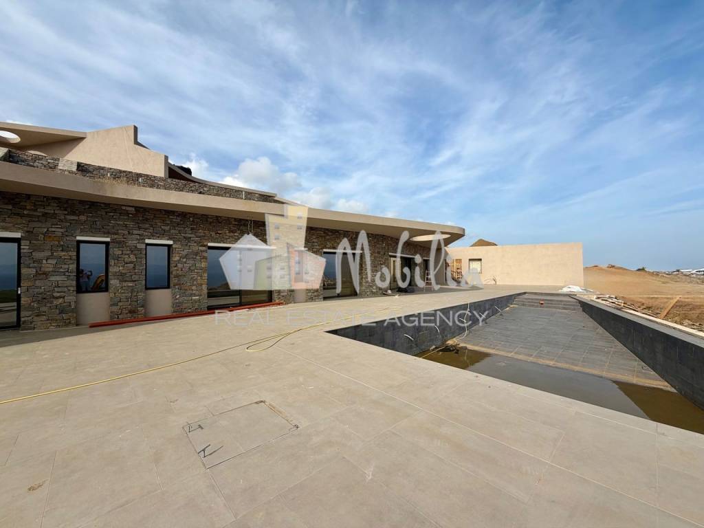 This newly built, high-end semi-underground villa is located in the southeastern part of Paros, boasting an impressive 180° sea view that extends from Marpissa to Lolantonis. Combining luxury with a modern, futuristic design, the villa offers an unparalleled sense of space and natural light. The residence features a spacious living room with a dining area and a semi-open kitchen, ideal for social gatherings. It includes four bedrooms, each with its own en-suite bathroom, as well as an additional bedroom with a small kitchen and private bathroom, providing complete independence—perfect for guests or older children. A defining characteristic of the villa's design is its expansive terraces on all sides, seamlessly blending the indoor spaces with the endless blue of the Aegean and the stunning natural surroundings. All rooms open onto a vast terrace that features a magnificent 95 sq.m. triangular swimming pool, a barbecue area, and an elegant outdoor dining and lounge space—an ideal setting for relaxation and entertainment. Additionally, the villa boasts a spectacular 120 sq.m. lounge area with large rear-facing windows that open onto charming courtyards, allowing natural light to flood the interior and creating a warm and inviting atmosphere. The basement level includes 80 sq.m. of storage space, with the potential to accommodate a utility room or an additional small bedroom with a private bathroom. This villa is part of an exclusive two-residence project, with the lower villa currently available for sale. The total indoor living space spans 480 sq.m., with the main floor covering 335 sq.m., comprising the bedrooms, kitchen, dining area, living room, and a guest WC. The independent guesthouse, located on a separate level, covers 60 sq.m.