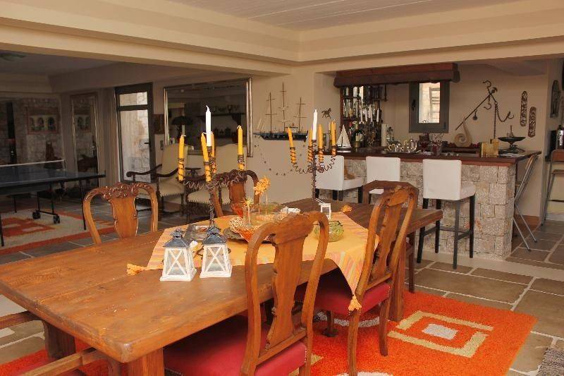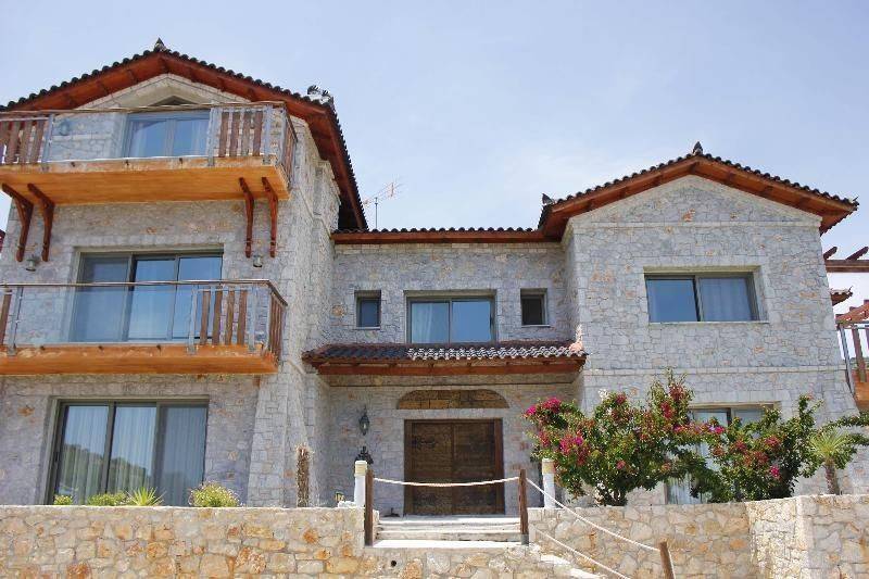 The first floor of 160 sq.m. consists of three comfortable bedrooms with private balconies,fitted wardrobes, two bathrooms, and gym. The upper floor of 60 sq.m hosts a huge en suite bedroom with a sitting place, a fireplace , a bathroom and coming out to a large private balcony with incredible view at the Argolic Bay. The architecture of the house following the traditional and the local available materials used, is complimented by landscaped gardens that surround it together with the huge swimming pool that adds the element of water in the great whole of the estate and the view to the lush green and the bay from inside the house throughout the year.