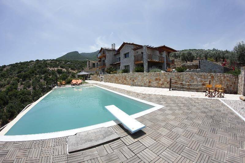 This 9 acres property is located at one of the most beautiful areas of North Kynouria, close to the virgin green hills of Xeropigado.This amazing 360 sq.m. furnished villa stands out for comfort and quality of construction, as it is fully furnished with lavish furnishing and appliances.The stone built exterior design that blends with the natural landscape, while at the same time reveals to the simple traditional lines of the interior. The ground floor of 160sqm consists of a large reception area with two spacious living rooms with fireplaces.The same level hosts a dining room and a kitchen with wooden cupboards and fitted modern electrical appliances and it is connected to utility and work places at the back side.