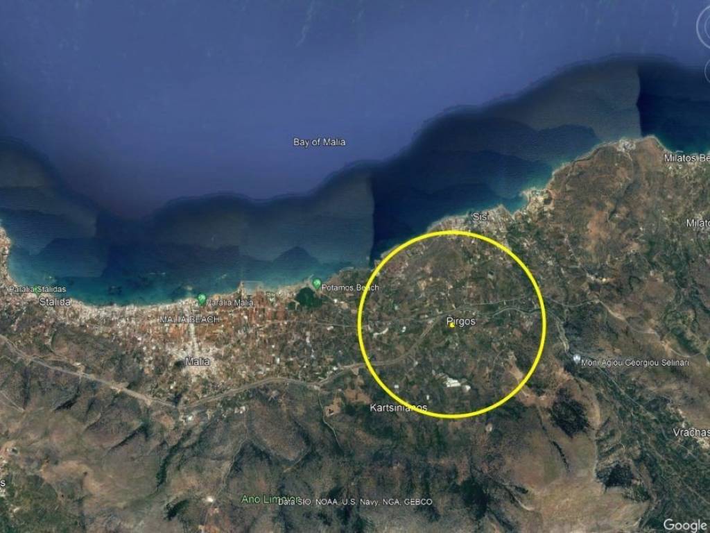 Αυτό το οικόπεδο των 2878 τ.μ. βρίσκεται σε ωραία θέση 1,7 χλμ. από τη βόρεια ακτή της Κρήτης, κοντά στη διάσημη τουριστική πόλη των Μαλίων και το γραφικό παραθαλάσσιο χωριό Σίσσι και κοντά σε πολλές ωραίες αμμώδεις παραλίες της περιοχής. Ένα μέρος του οικοπέδου βρίσκεται εντός της πολεοδομικής ζώνης του χωριού και έχει την πολεοδομική δυνατότητα για την κατασκευή κατοικίας ή κατοικιών συνολικής επιφάνειας έως 240 τ.μ., συν υπόγειο και σοφίτα. Αρκετός χώρος θα μπορούσε να παραμείνει για την κατασκευή πισίνας (-ων), ανοικτών ή στεγασμένων βεραντών και ταράτσες, χώρων στάθμευσης, χώρων κήπου κ.λπ. Διαθέτει άμεση πρόσβαση σε ασφαλτοστρωμένο δρόμο και όλες οι υπηρεσίες (ηλεκτρικό ρεύμα, ύδρευση, τηλέφωνο και ευρυζωνικό διαδίκτυο) είναι διαθέσιμες επί τόπου. Απολαμβάνει θέα στη γύρω ύπαιθρο, στα βουνά και λίγο στη θάλασσα. Η πλησιέστερη παραλία απέχει μόλις 3 λεπτά με το αυτοκίνητο. Η πόλη των Μαλίων απέχει περίπου 4,5 χιλιόμετρα από το οικόπεδο. Το διεθνές αεροδρόμιο του Ηρακλείου απέχει περίπου 25 λεπτά με το αυτοκίνητο. Η πόλη του Αγίου Νικολάου απέχει περίπου 20 λεπτά με το αυτοκίνητο προς τα ανατολικά. Ο Άγιος Νικόλαος είναι η πρωτεύουσα του νομού Λασιθίου και βρίσκεται στον κόλπο του Μιραμπέλλου, στη βορειοανατολική Κρήτη.