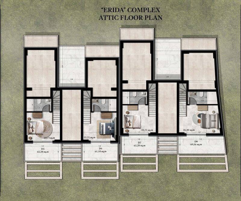 • 4 Διαμερίσματα ορόφου με σοφίτα 61,10τ.μ. έως 69,56τ.μ, που αποτελούνται από σαλοκουζίνα, 2 υπνοδωμάτια, 2 μπάνια.