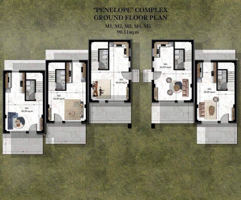 • 5 Three-story houses 90,11sq.m. consisting of a living room with kitchen, 2 bedrooms, 3 bathrooms.