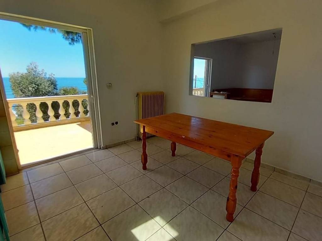 A 96-square-metre second-floor apartment is available for purchase in Drosia, offering unparalleled vistas of the sea from its privileged position. The property comprises two bedrooms, a separate kitchen, a living room complete with a fireplace, and a bathroom. The apartment is well-lit and benefits from balconies on all sides. The property is situated just 20 metres from the beach and includes a parking space and a share in the communal garden.