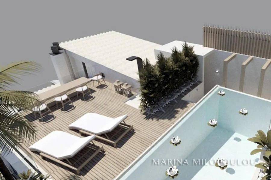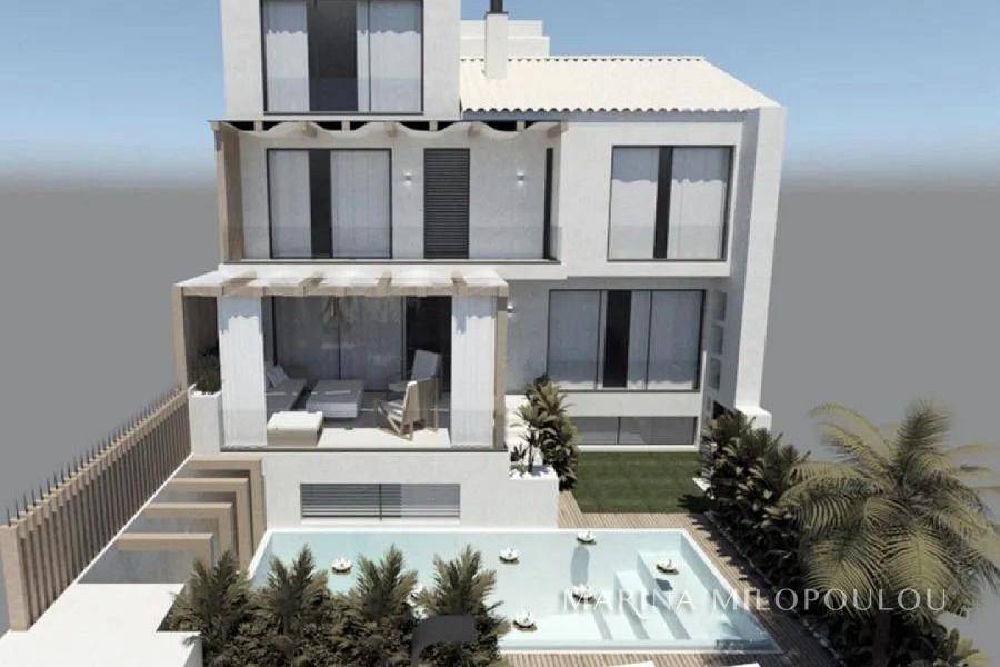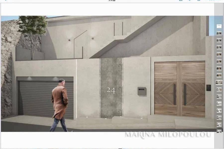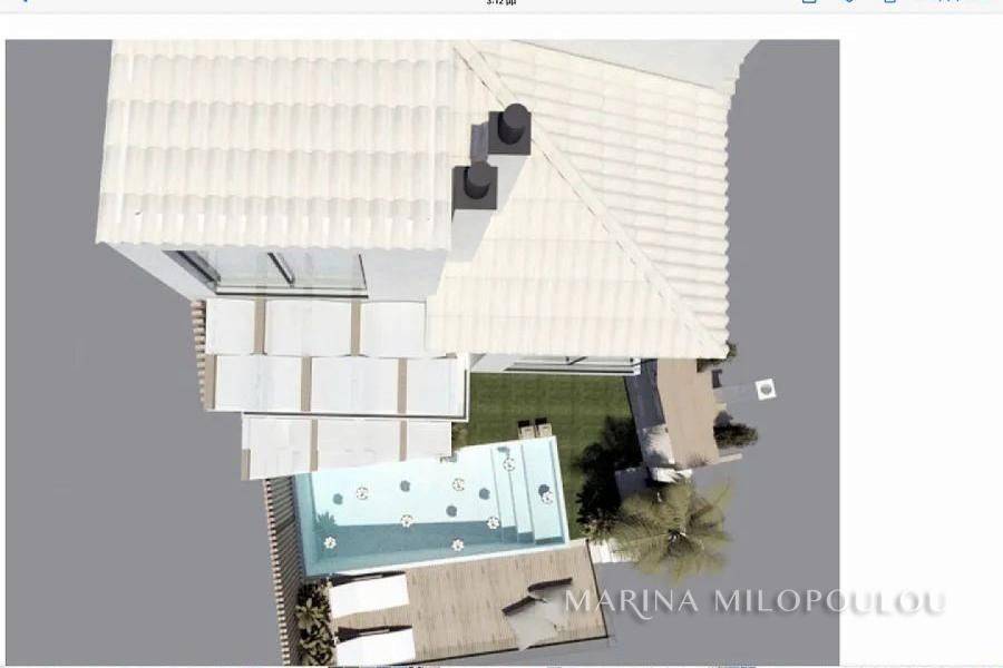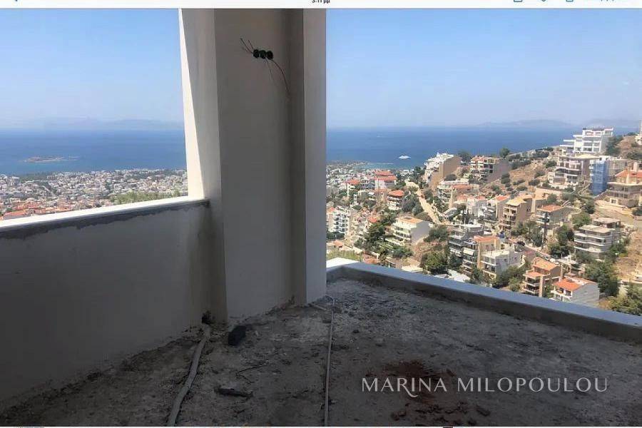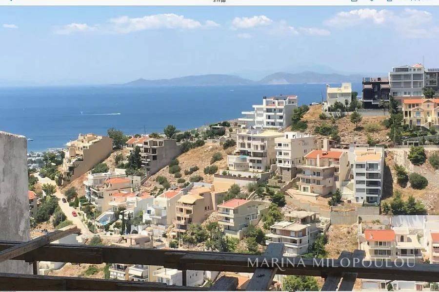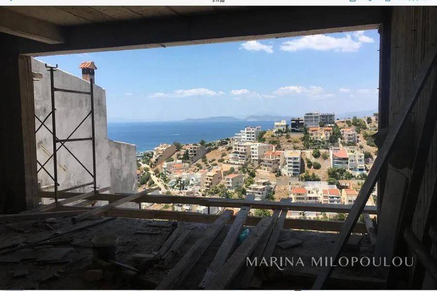 VOULA-Panorama, unfinished Maisonette, 185sqm, 3 levels with independent apartment 67sqm, (total 252sqm), with private pool-garden, unlimited sea view. West orientation. -Ground floor, independent apartment 67sqm, with open plan livind room-kitchen with fireplace, 1 bedroom and 1 bathroom. -1st floor, 76sqm, reception area, open plan kitchen and 1 wc. -2nd floor, 76sqm, 3 bedrooms, 1 bathroom and possibility of additional bathroom and walk-in closet. -3rd floor, 33sqm, large attic with a bathroom. The 67 sq. m. apartment and the 185 sq. m. maisonette can be used as independent apartments, but also as a single residence. It features a large elevator that reaches all floors (even the attic and the underground parking for 3 cars), internal and external staircase, security door, autonomous heating with a heat pump, energy-efficient fireplace. It also has a special thermal facade under the roof, thermally insulated frames with triple glazing and screens (in the living rooms they are of a new type so that the aluminum on the floor is not visible), large verandas, a security alarm and 10 cameras around the perimeter with motion detection, a 50sqm storage room. Pending for the completion of the maisonette (at the buyer's expense), are the floors, sanitary ware, wardrobes, kitchens, tiles, painting, tiles in the swimming pool, the garden land scaping (total cost approx. €200,000). It forms part of a complex consisting of two maisonettes, positioned one above the other due to the natural slope of the plot. Very quite and paoramic location, 1 km from Agios Nektarios Square, with a cafe and mini market, 3.2 km from the center of Voula, 4.2 km from Voula's organized beach.