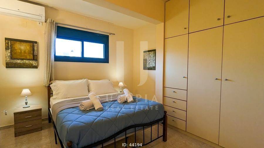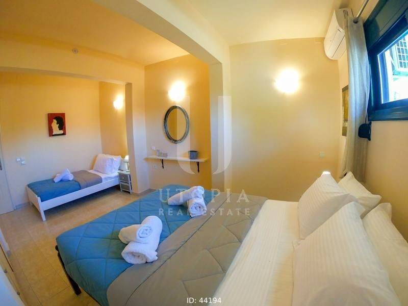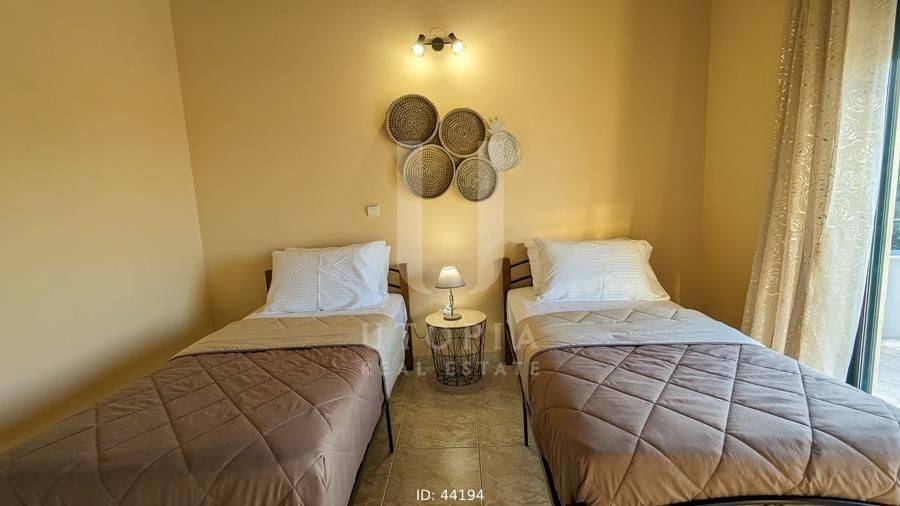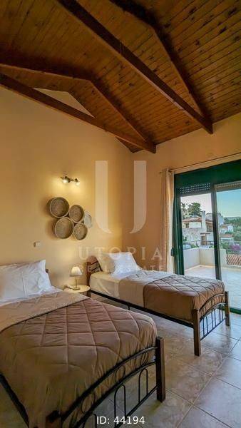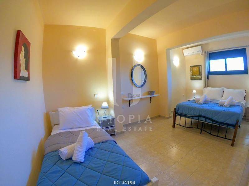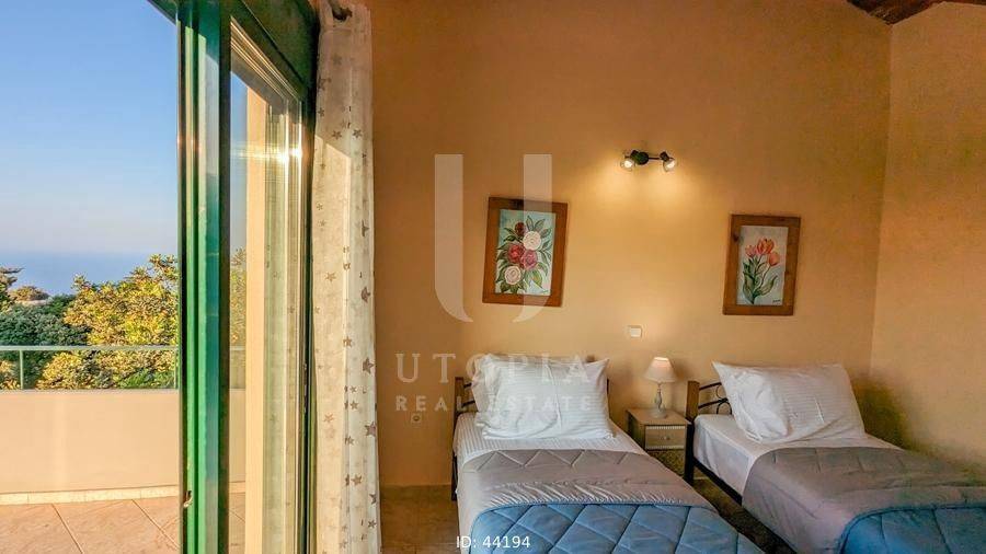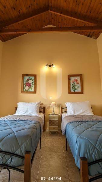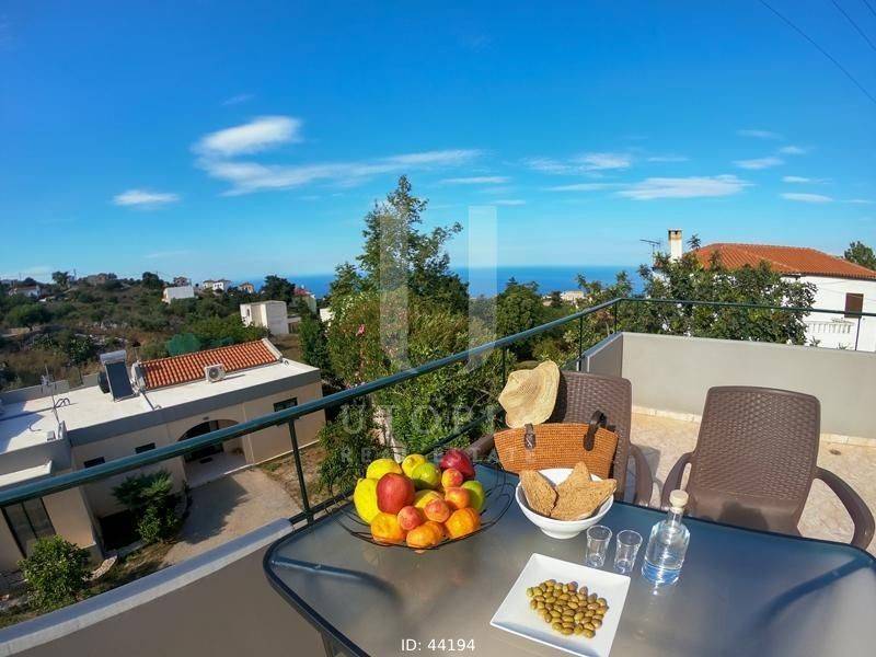 Vamos, Kefalas - Villa 170sqm fully furnished, levels 2, ground floor - 1st, year built 2004, energy class A+, living room, kitchen, 2 bathrooms, wc, heating type: autonomous (wood), air condition, quiet, dual aspect apartment, luminous, frontage, storage space, solar heater, fireplace, balconies, large balconies, garden, private terrace, aluminum frames, double glazed windows, secure door, luxurious, private pool, pets allowed, residential zone.
