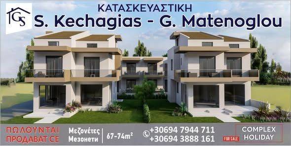 /Νέο Εξοχικό- Οικιστικό Συγκρότημα «HOLIDAY» Η Εταιρεία μας "GS Κατασκευαστική" Σ.Κεχαγιάς Γ. Ματενόγλου . Ετοιμάζει το νέο οικιστικό-εξοχικο συγκρότημα «HOLIDAY», σε κεντρικό σημείο της Παραλίας Οφρυνίου, μόλις 120 μέτρα από τη θάλασσα. Το συγκρότημα αποτελείται από 4 σύγχρονα κτίρια, σχεδιασμένα για άνεση και λειτουργικότητα, σε ένα όμορφο, πράσινο περιβάλλον. Διαθέσιμα ακίνητα ✅ Μεζονέτες (4 διαθέσιμες) Εμβαδόν: 67–74 τ.μ. Διαρρύθμιση: Σαλοκουζίνα 2 υπνοδωμάτια 2 μπάνια Εσωτερική σκάλα Βεράντες Θέση στάθμευσης ✅ (8)Διαμερίσματα 37 τ.μ. — SOLD OUT ✅ (2)Καταστήματα 73 τ.μ. — SOLD OUT Χαρακτηριστικά συγκροτήματος Σύγχρονη αρχιτεκτονική & κατασκευή Ενεργειακή κατηγορία Θέσεις στάθμευσης Πράσινοι εξωτερικοί χώροι Σύγχρονα έπιπλα κουζίνας & είδη υγιεινής υψηλού επιπέδου Στόχος μας είναι να δημιουργήσουμε για εσάς ένα άνετο και ποιοτικό περιβάλλον διαβίωσης στις διακοπές σας. Ημερομηνία Παράδοσης: 30/10/2026 Επικοινωνία Κλείστε σήμερα τη θέση σας και κάντε πραγματικότητα το εξοχικο σπίτι των ονείρων σας! Τηλέφωνα: 6947 944711, 6943 888161