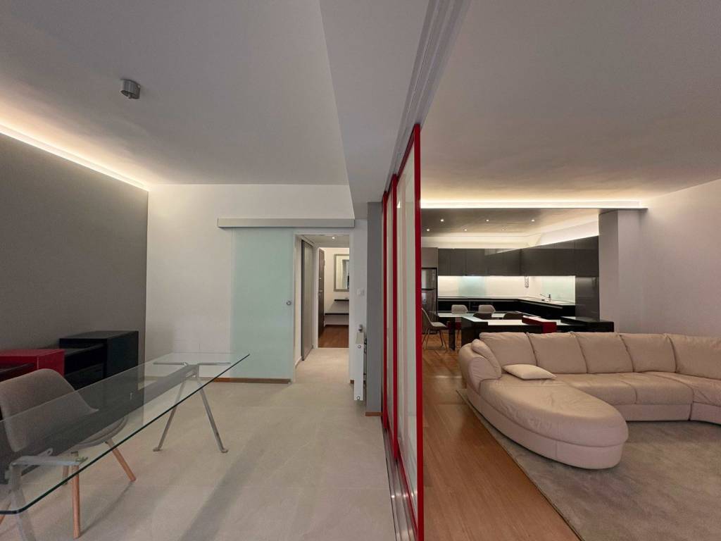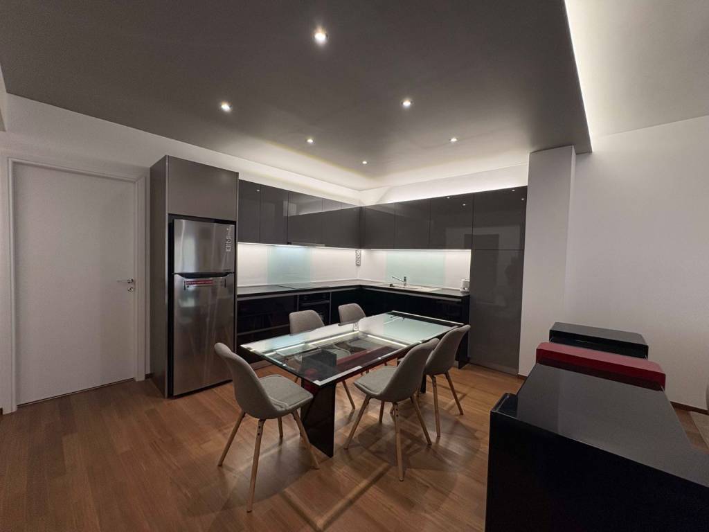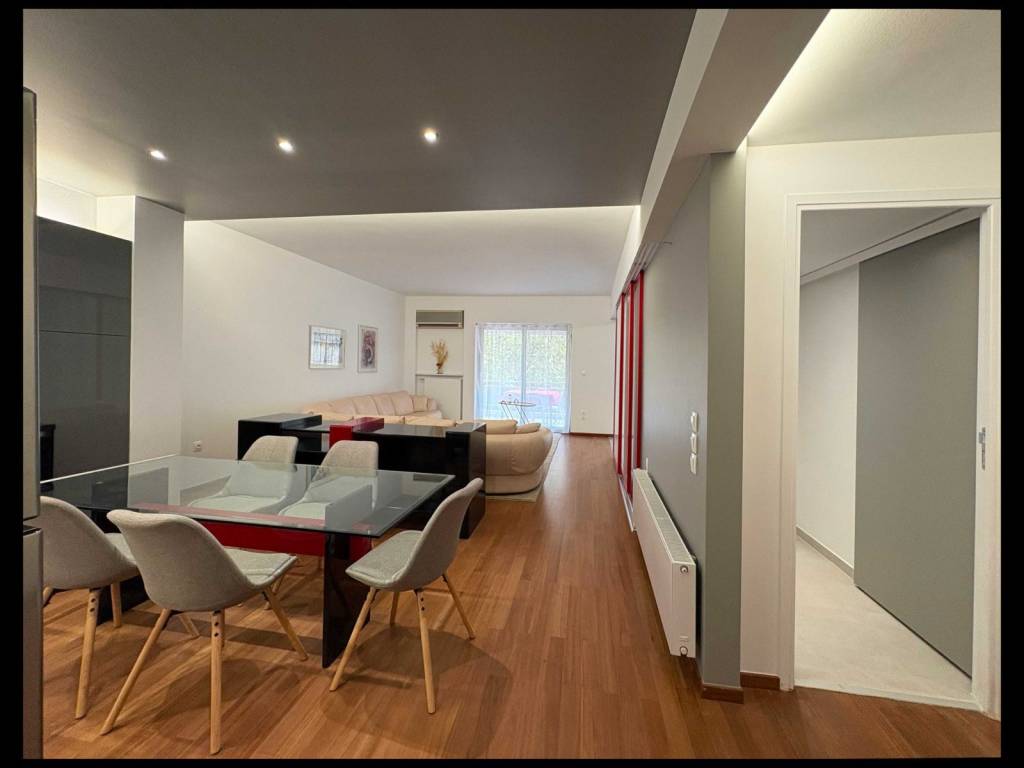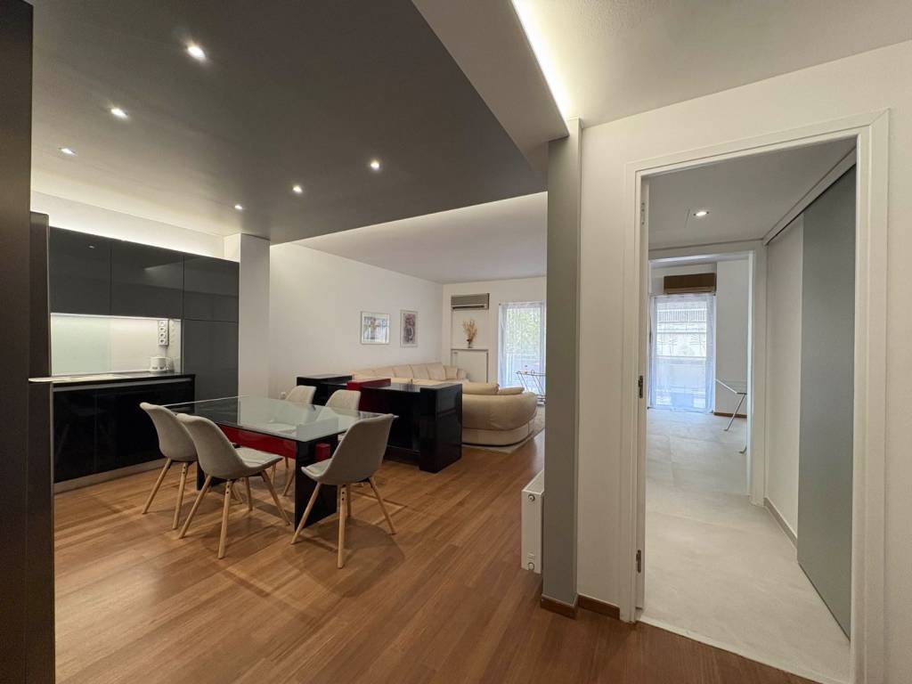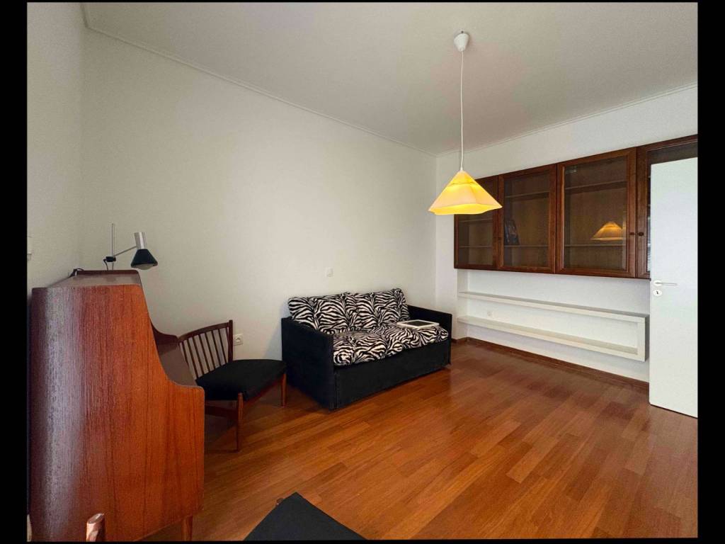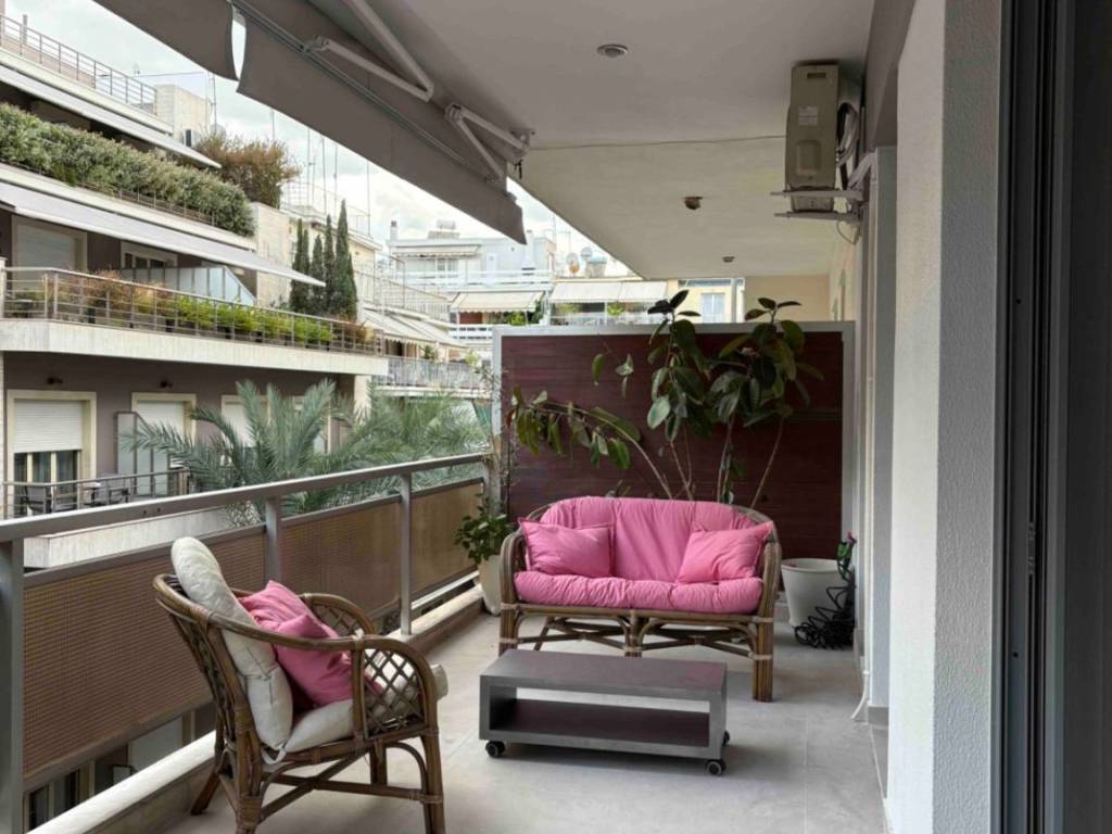 This is a fully furnished 4th floor apartment (114m2), renovated in 2025, bright, in a well-kept, quiet apartment building of a few apartments, two per floor, with the main areas of the apartment on the pedestrian street of Arnis Street, with tree-planted front gardens and has a parking space. The apartment is also suitable for hosting official guests and employees. The apartment is only two minutes from the Megarou Mousikis metro station and five minutes from the Hilton Hotel. It has a large living-dining room area (Iroko wooden floors) with an open fully furnished kitchen with built-in electrical appliances in first use, and a large front terrace (16m2) with electric awnings, which also has a small outdoor storage room. It has two spacious bedrooms with built-in wardrobes, also covered with wooden floors (Iroko), and has access to a balcony overlooking the uncovered space. It also has a large office space on the facade, which can alternatively be used as an additional independent bedroom. Another small utility room/storage room, with a second refrigerator and washing machine, is located inside the apartment. The two bathrooms, a spacious bathroom with bathtub and shower, as well as a small guest bathroom with shower, are particularly well-furnished, with the ability to serve people with special needs. The apartment has independent autonomous gas heating, as well as air conditioning in all areas. It is classified in energy category C, while, among other things, it has modern double glazing and screens. A parking space is available for this apartment on the ground floor piloti. It is noted that the apartment building, as well as the apartment, have security doors.
