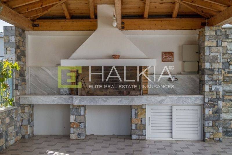 On the lower level (165.68 sq.m.), there is a small independent apartment of 28 sq.m. with a bedroom, bathroom, and living area—ideal for guests or private use. The same level also includes a three-car garage, boiler room, and storage areas. The middle level (130.33 sq.m.) features a bright entrance hall with a study area, four bedrooms with wardrobes and balconies, and two bathrooms. The master bedroom includes its own en-suite bathroom and walk-in closet. The top floor (146.33 sq.m.) hosts the main living and dining area with a fireplace, two kitchens, a W.C., and a large veranda offering beautiful sea views. Outdoors, the property includes a landscaped garden with lawn, a covered dining area, and a built-in barbecue, while the stone façade adds a natural and timeless touch to the exterior. The villa is fully equipped with modern amenities: elevator, oil heating system with independent thermostats on each level, air conditioning, solar water heater, alarm system, video intercom, and aluminum frames with double glazing and insect screens. Its close distance to the sea and easy access to the city make it an ideal choice both as a permanent residence and as a holiday home.