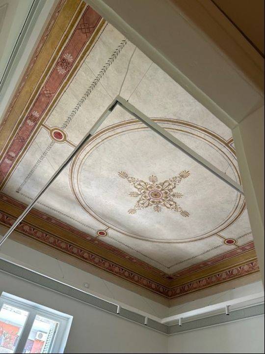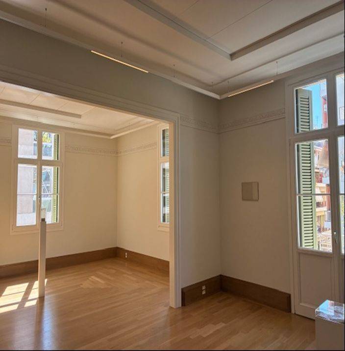 In the area of the Archaeological Museum, an excellent independent 1,300 sq.m corner building, with two entrances, is available for lease. The building, which has been designated by the Ministry of Culture as a Historical Architectural Monument, was constructed at the end of the 19th century as the residence of a prominent military officer and during its life had different uses, before being revived, after its restoration, as a space for contemporary art : - Τhe building's load-bearing structure was reinforced in accordance with the relevant legislation in force, a new staircase and elevator for the disabled were added and it was energy-shielded with modern electromechanical installations, - conservators and a specialized architectural office worked for three years to uncover, restore and preserve the 19th century ceiling paintings, - the plaster decoration, doors and cement tiles of the 20th century were transferred to specialized workshops where they were meticulously repaired and reinstalled and, - on the building's rooftop, the graffiti from the period when the building was occupied were saved and repaired, as a sample of modern urban life in the building's history and a space for meetings and lectures was created.