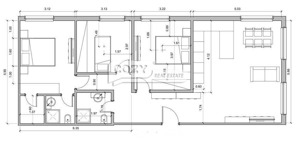 This property features 3 bedrooms, an open kitchen with a living room and 2 bathrooms.