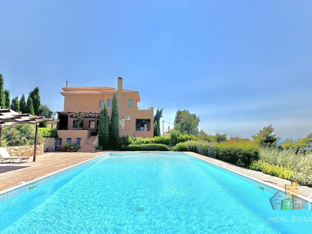 This 410-sqm country-style house, built on a hill in 2005 on a 1,333-sqm plot, offers absolute privacy and panoramic views to the sea. It will be available from May 2026. The exterior features large terraces, a heated swimming pool with wooden deck and a landscaped garden planted with lavender and shrubs. The house is developed on four half levels, all served by an elevator, combining comfort and functionality. In the semi-basement, which has direct access to the garden, there is a playroom, a bedroom, a bathroom, a kitchenette, a hammam, a storage room and a garage with two parking spaces. The raised ground floor includes a reception area with a living room and a marble fireplace, a fitted kitchen and an additional space that can be used as an office or sitting room. From this level, there is access to three covered terraces with beautiful views. A few steps higher, on the first floor, there is a WC, a bedroom, a bathroom, a laundry room and a storage room. The second floor hosts a spacious master bedroom with private bathroom and comfortable wardrobes, as well as a small area ideal for an office or sitting room. On the top floor, there is another master bedroom with its own bathroom. The residence is located close to international schools. Pendeli with shops and services is just 2 km away; while in Pallini, (6 km) there are metro and suburban. The airport is 20 minutes by car. Mobilia Real Estate, Contact Phone:+30 2107563200, email: info@mobilia.gr, website: www.mobilia.gr