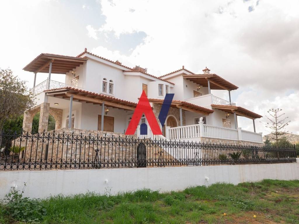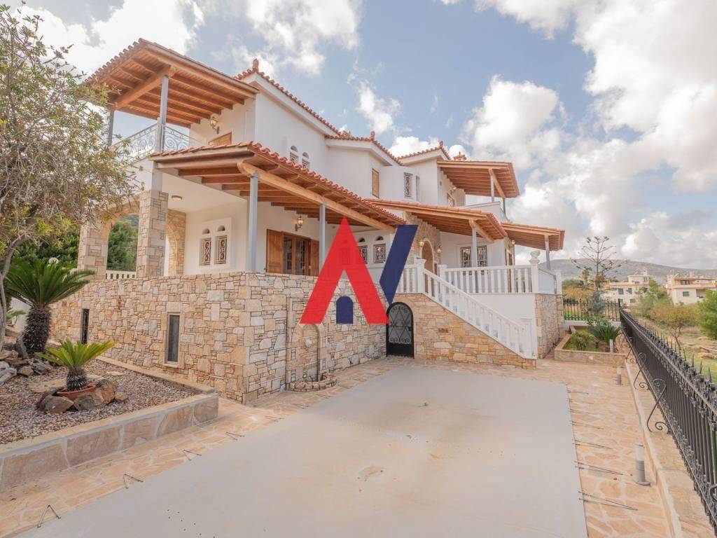 For sale: Luxurious, airy, and sunny villa with pool and mountain and sea views in Porto Rafti. It is located in a residential area, very close to a well-known beach in the area. The villa has a total area of 240 sq.m., of which 165 sq.m. are the main areas and 75 sq.m. are auxiliary spaces. It is built on a plot of 476 sq.m. and has an outdoor swimming pool with dimensions of 3m x 6.70m and a depth of 1.5m. More specifically, on the raised ground floor which has an area of 94 sq.m. there is the main entrance, a large bright living room with a marble fireplace and access to verandas all around, a large W.C. on a higher level, a comfortable, separate, luxurious kitchen equipped with built-in electrical appliances and access to a veranda and 1 guest house ~15 sq.m. with its bathroom and separate entrance. On the first floor which has an area of 71 sq.m. we find 2 comfortable bedrooms leading to verandas, while there is the possibility of configuring 3 bedrooms, a small living room - office space and 1 very large luxurious round bathroom with a vaulted ceiling and a round bathtub. In the basement which has a total area of 75 sq.m. there is the garage, the boiler room, storage spaces and the laundry room. The property was built in 1992 and was completely renovated and upgraded during the years 2022 to 2024. The energy class is D. It has autonomous oil heating (with boiler & solar water system), air conditioning, handmade wooden frames made of Oregon wood and double glazing, alarm system, closed circuit television, antenna & internet, two main entrances, stone arches and several stone walls, balconies with ceilings covered with pine wood and decorated steel railings. The garden is landscaped with trees/grass/flowers and the outdoor swimming pool. The asking price is €850,000. Property code: ΜΟΚ00786