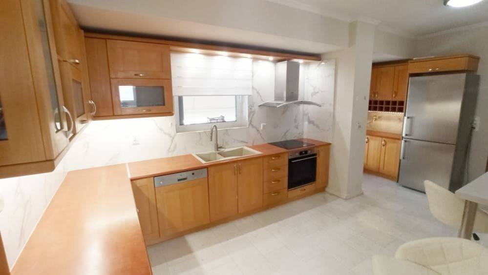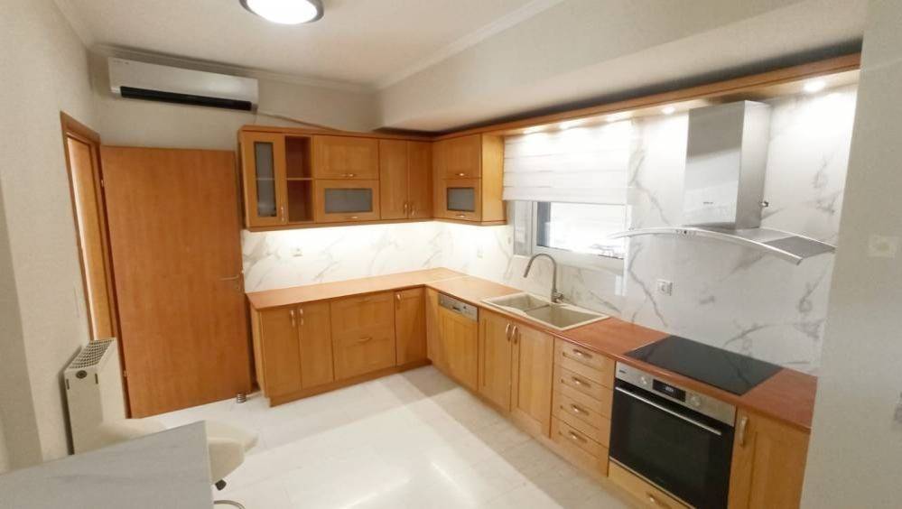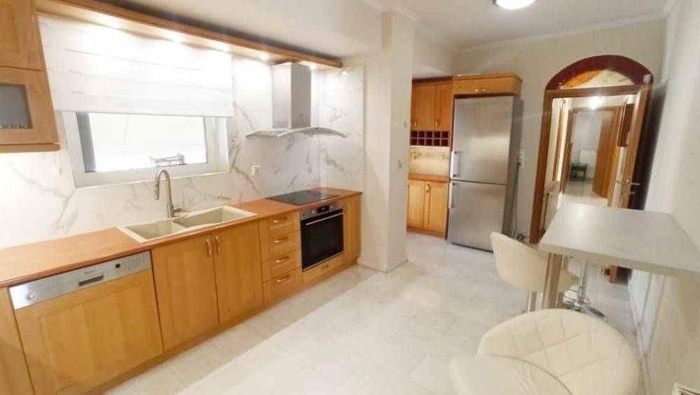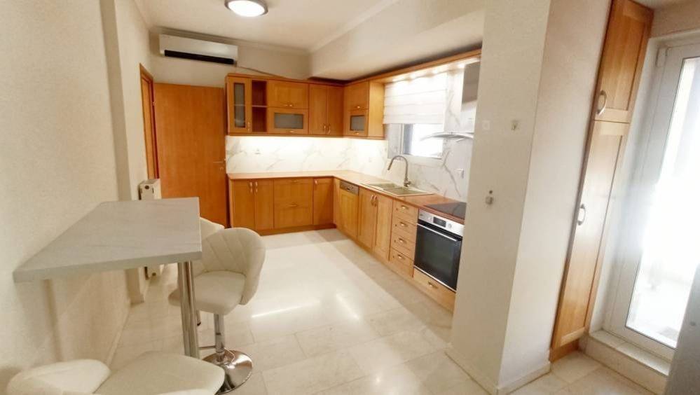 Suburbs of Piraeus, Keratsini: For rent a fully renovated bright Apartment of 108 sq.m. luxury, frontage on the 5th floor (last) with autonomous oil heating. It consists of 3 bedrooms, 1 kitchen, 1 living room, 2 bathrooms, 2 balconies and 1 outdoor (covered) parking space. It is partially furnished and equipped with electrical appliances of 2024 (fitted kitchen, refrigerator, fitted dishwasher, washing machine, 1 double bed, living room set, office, library). It is built in 1992, painted, close to schools, public transport, super market, market, square, pharmacy, 1.5 km from Maniatika metro stop (BLUE LINE) and 10 minutes walk from ANDREAS PAPANDREOU park. It has an open view, aluminum frames with double glazing, security door, 5 air conditioners, marble floors, fireplace, awnings, screens, alarm, video intercom and solar water heater. It was completely renovated in 2019 and 2024 in the electrical, plumbing, bathroom and the terrace has been insulated. It is ideal for families or employees. REAL ESTATE AGAPIDIS E.E. ATHENS - CORINTHIANS. Price 1,100€ | Property Code: #GPA 26125
