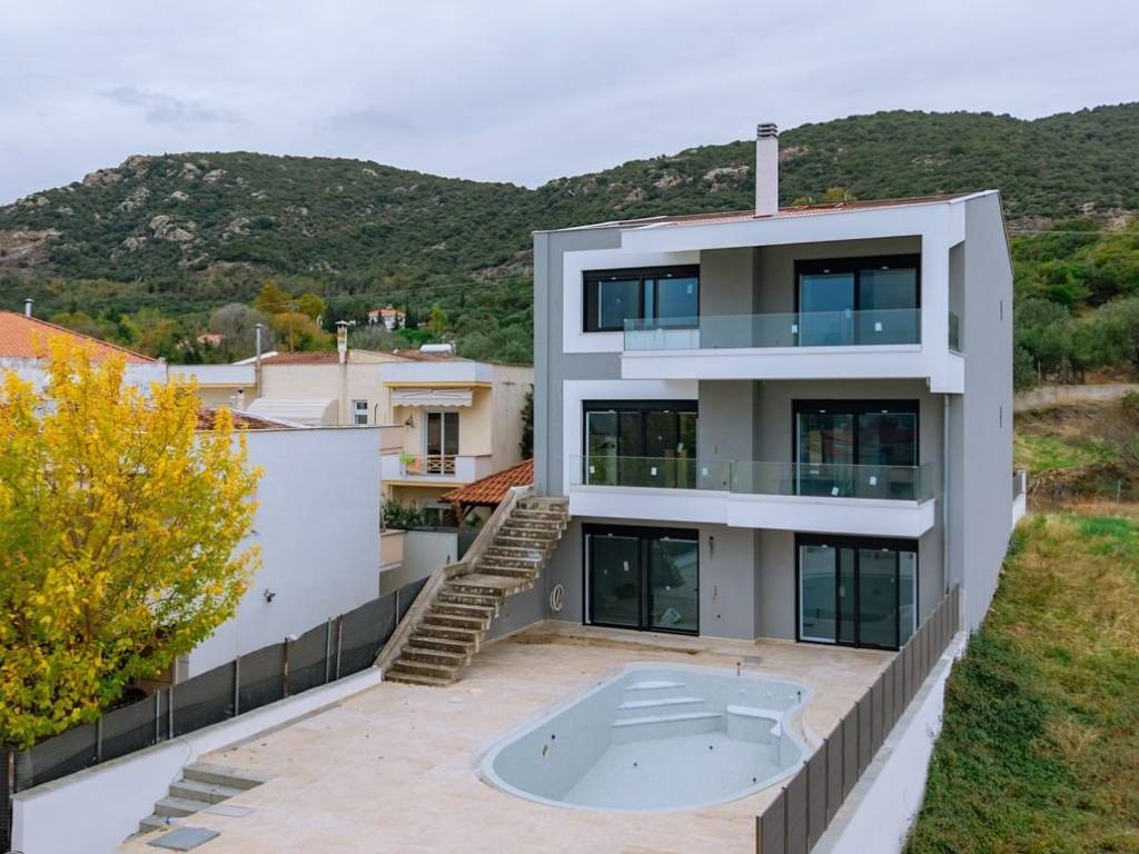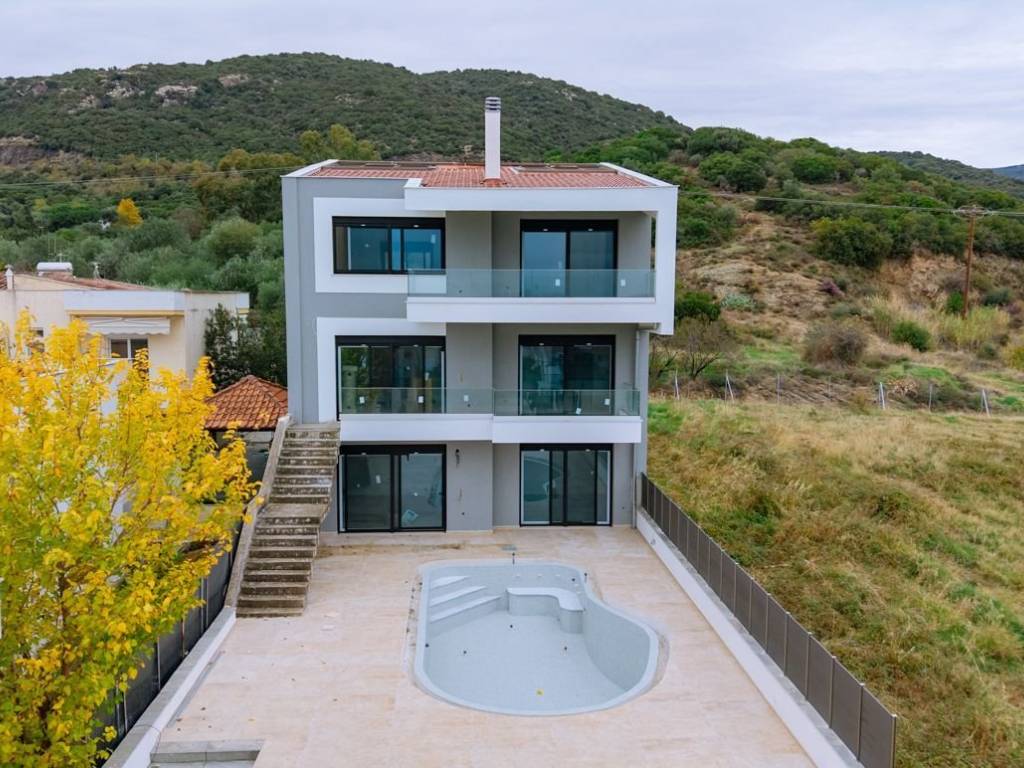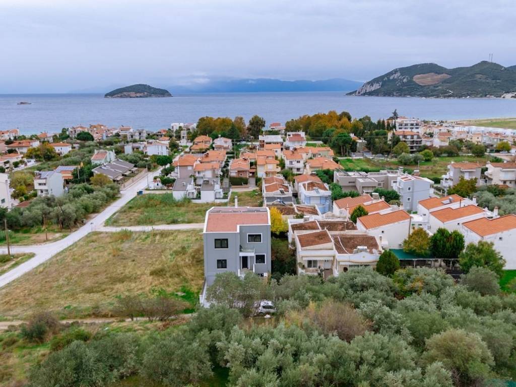 This luxury villa, currently under construction, is located in Nea Iraklitsa and offers comfortable accommodation and unlimited panoramic views of the Aegean Sea and the bay of Nea Iraklitsa. Contemporary influences from Mediterranean architecture meet timeless elegance. The bright house is characterized by abundant natural light, which enters the interior through large windows, glass facades, and open spaces. It transforms simplicity, clean lines, and elegant silhouettes into bright spaces, where timeless natural materials are combined with the bright light of the Aegean sun. The house has a total area of 350 m², spread over three floors, and is located on a hill with a plot of 512.39 m², surrounded by a beautiful garden with paved floors, a private pool with space for sun loungers, and 2 parking spaces at the south side entrance. The main entrance is at the rear (north side) and leads directly to the first floor with a total area of 125 m², which consists of two spacious bedrooms with a dressing room and bathroom. On the same floor, there are two additional bedrooms and another bathroom with a toilet. Ascending the internal staircase, we reach the second floor with an open space of 125 m². Here we find the spacious living room, the dining room, the kitchen, and a dressing room with a bathroom. Additionally, there is sufficient space for a workspace. The internal staircase also leads from the main entrance to the ground floor, with a total area of 100 m². The large living room, as well as the adjoining kitchen and dining room, are flooded with natural, warm sunlight from the south side, thanks to the large balcony doors leading to the garden and pool. In addition, on the ground floor there is an extra bedroom, a bathroom with toilet, as well as a boiler room or storage room and laundry room at the rear, offering ample storage space. The parking spaces can comfortably accommodate two large SUVs. The house is heated in winter and cooled in summer with a heat pump with fan coils and has security doors and an alarm system. The property ensures privacy and at the same time is only 300 meters from the beach and close to the city center. The location of the villa is convenient and quiet - just 45 km from Kavala airport, 500 meters from the center of Nea Iraklitsa and about a 10-minute walk from the beach, one of the most picturesque and lively areas of the entire Kavala coast. This property is suitable for both permanent residence and investment purposes, combining privacy, comfort, and modern design in one of the most sought-after locations in Kavala. Nea Irakleitsa, a seaside location in the region of Kavala, offers a unique opportunity in the real estate market for those seeking a combination of natural beauty, comfort and affordability. The area is known for its stunning beaches, with crystal clear waters and lush green slopes, making Nea Irakleitsa ideal for holiday homes and tourist property investments. It is located just 15 km from the city of Kavala, offering easy access to urban amenities, while its proximity to the Egnatia Highway ensures fast and comfortable travel. The "Alexander the Great" airport is approximately 45 km away, making the area ideal for visitors from abroad. The local real estate market is characterized by a wide range of choices, from luxury villas with sea views to modern apartments that cover every need. The serene atmosphere, combined with the proximity to central locations such as the port of Kavala and the popular tourist resorts of the area, gives the properties of Nea Iraklitsa excellent value and potential for return on investment. Explore the real estate market of Nea Iraklitsa and discover the ideal property in an area that combines the tranquility of nature with the practicality of modern life.
