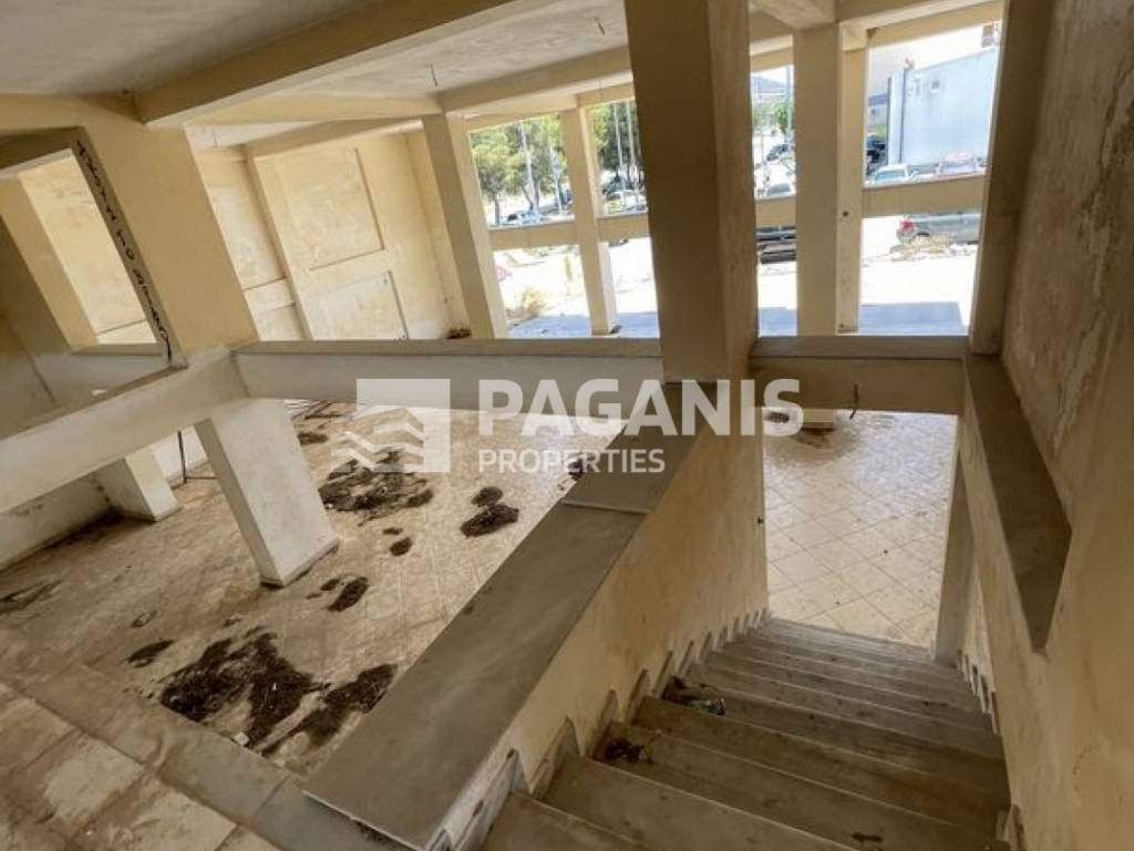Kalyvia (center) Commercial building 1,100 sq.m., with facade and access to two streets, built in 2009, unfinished, 4 levels, with large lawn on both streets, Basement ramp, consisting of a basement of 355 sq.m., ground floor of 385 sq.m., Mezzanine of 140 sq.m. and 1st floor of 360 sq.m.. Suitable for many uses. East facing. Located near Super Market