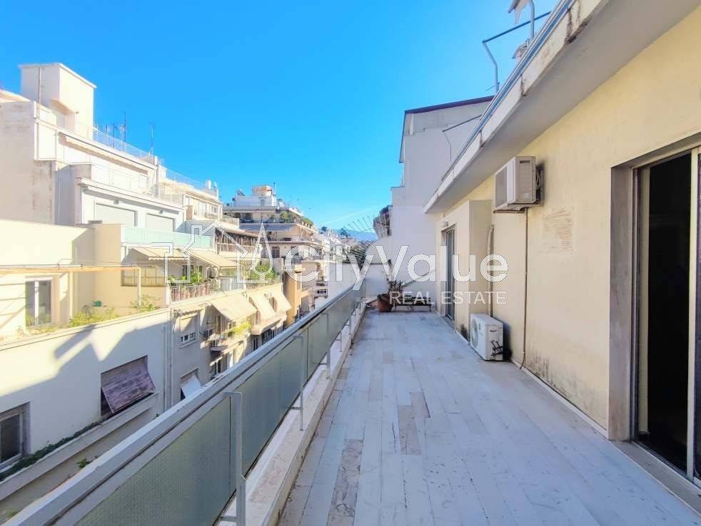 In Kolonaki, a penthouse office of 103 sq.m. is available for rent, featuring frontage, dual-aspect layout and exceptional natural light, in an excellent location close to Kolonaki Square, within an elegant and well-maintained building. The property comprises four functional rooms, a reception area, a kitchen and a bathroom, and benefits from a large veranda with open views, aluminum window frames, marble floors and elevator access. It is suitable for any type of professional use, offering a refined and pleasant working environment in one of the most central and prestigious areas of the city.