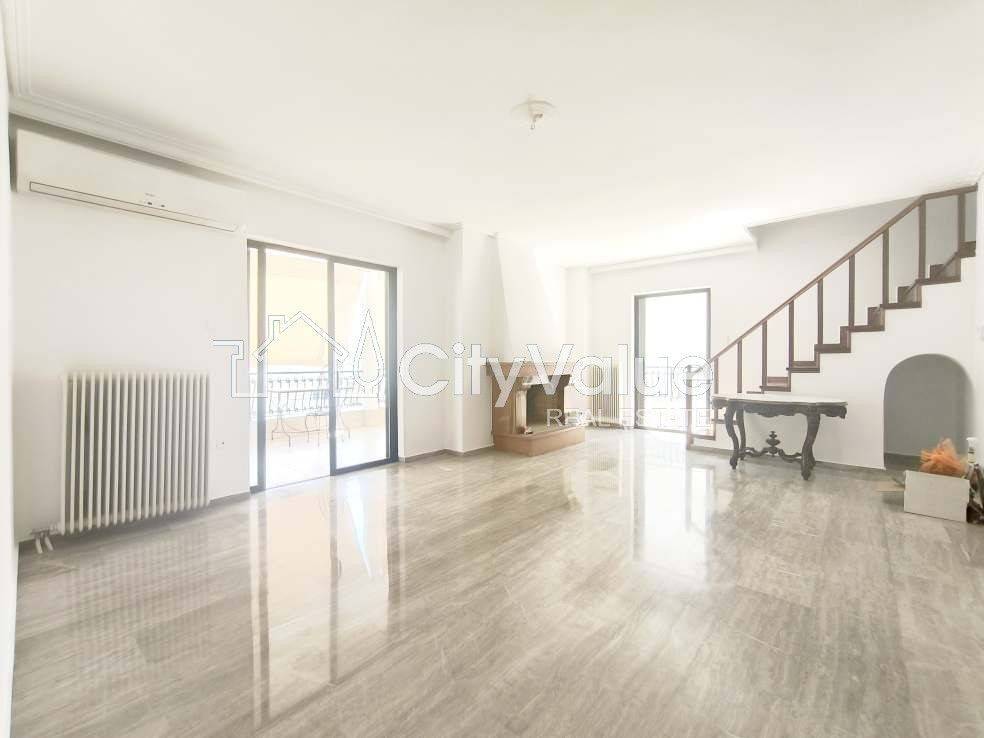 PEFKI – A penthouse maisonette is available for sale, located on the fifth and sixth floors, with a total area of 180 sq.m., front-facing, bright, and with an excellent layout. It is situated near Katsimpali Morela Grove and consists of two living rooms, one with a fireplace, three bedrooms, a kitchen, two bathrooms, a WC, large verandas, and a parking space in the pilotis. It features autonomous heating with oil, a solar water heater, air conditioning, aluminum window frames, awnings, and a security door.