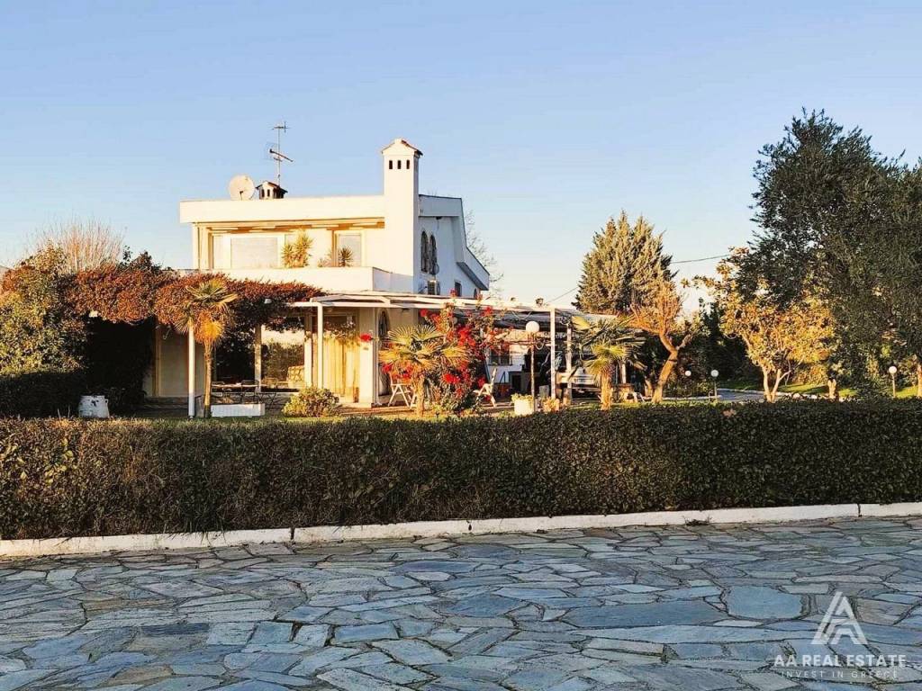 EPANOMI BEACH-THERMAIKOS is for sale a beautiful villa, first to the sea, of high aesthetics and quality construction, fully furnished and equipped, with an area of ​​240 sq m, as well as an independent detached house/guest house of 65 sq m, on a plot of 1,500 sq m, in a total area of ​​9,500 sq m. where there are two more villas with which it shares the swimming pool, the tennis court as well as the maintenance costs of the common areas. This is a fully furnished and equipped autonomous villa, of excellent construction in 1991. OUTDOOR AREA: GARDEN- SWIMMING POOL- TENNIS -BARBEQUE: The house is surrounded by a huge green private garden with well-kept plants and some trees. The garden has an automatic irrigation system, a specially designed covered private area with a built Barbeque. stone floor, pergola On the side of the common area we find the impressive swimming pool, and a large tennis court, built fence PARKING- STORAGE- HEATING: open covered space for at least two large cars, three storage rooms in one of which the central oil heating system of the residence is installed, with a large burner which has a boiler for supplying hot water, while there are also fan coils. A. VILLA It consists of three levels, has 3 bedrooms, a large living room with fireplace, living room, office, two kitchens, 3 bathrooms. GROUND FLOOR- a very beautiful bright large living room with large openings, also a beautiful living room-kitchen-dining room with fireplace, storage room 1st FLOOR- two spacious rooms, a comfortable bathroom, and a beautiful large bedroom-masterbedroom with a large bathroom and a wonderful terrace with a unique view with large openings that allow light to enter and enjoy the amazing view. In the BASEMENT-SAUNA large living room-kitchen-office with fireplace, sauna, a bathroom with WC. B. INDEPENDENT GUEST HOUSE next to the villa we find a completely independent and autonomous house of 65 sq m. consisting of a large living room-kitchen-dining room, two comfortable rooms and a bathroom with WC. They have synthetic double glazing frames with screens, tiled floors, impressive marble stairs, security door, large balconies. It is located just 100 meters from the beach, 5 minutes from Potamos beach with the famous beach bars, 10 minutes from the center of Epanomi, 25 minutes from Thessaloniki airport and just 30 minutes from Mediterranean Cosmos. It is an excellent choice for a residence in a privileged green, quiet environment next to the sea and at the same time with easy access, very close to all areas of Thessaloniki, the airport and Halkidiki. open parking spaces 2, distance from the beach 100, number of entrances 2, terace, type of glass duble, land surface 1500, energy class Γ, build in BBQ, country house, investment, furnished, indoor lader, garden, air conditioning, frames synthetic, equiped, swimming pool, luxury home, security door, orientation eastmeridian, access asphalt, facade, insect screen, flooring type tile, bright, view sea