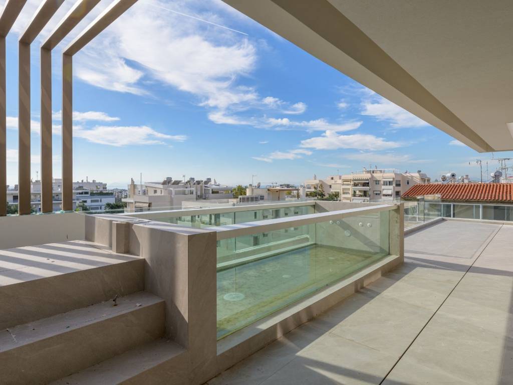 A superb penthouse maisonette ideally located in one of Glyfada’s most sought-after areas, close to the Golf course and the vibrant city center. The 234 sq.m. residence occupies the 4th and 5th levels of a newly built boutique building of 10 units. It unfolds across two levels connected by an internal staircase as well as a private elevator, and benefits from an additional 150 sq.m. of outdoor spaces with beautiful sea views. The 4th floor features a bright living room with a contemporary fireplace, an elegant dining area, an open-plan kitchen, the master bedroom with en-suite bathroom, a guest W.C., and an impressive 8 sq.m. jacuzzi on the veranda. The 5th floor hosts 2 bedrooms with en-suite bathrooms. The property includes 2 parking spaces equipped with electric vehicle charging provision, as well as 1 basement storage room. Belonging to Energy Class A+, the maisonette offers full autonomy and cutting-edge specifications: underfloor heating, VRV cooling system, energy-efficient fireplace, and a smart-home infrastructure. It is constructed with top-quality materials and is due to be delivered on February 2026. An exceptional penthouse maisonette with sea views in the heart of Glyfada.