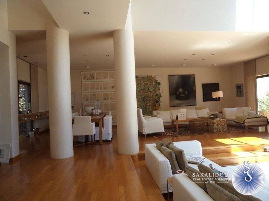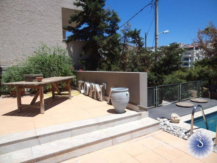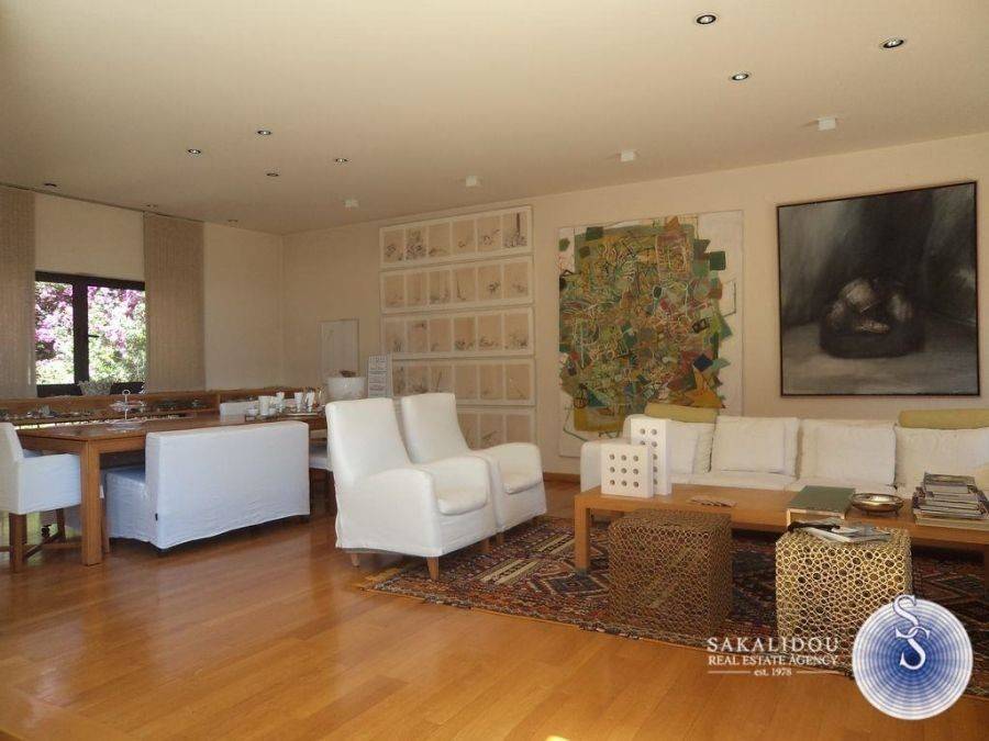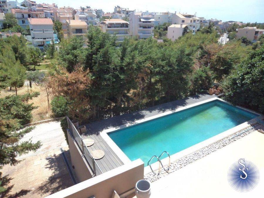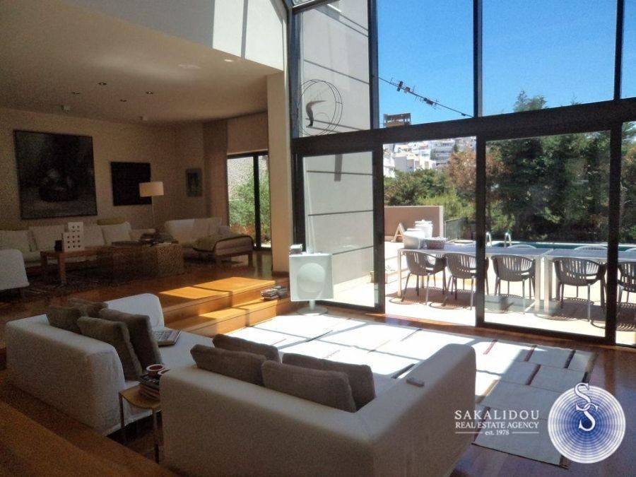 In the prestigious area of Voula, Dikigorika, this stunning luxury detached residence of 480 sq.m. is set on a 550 sq.m. plot, featuring exceptional minimal architecture and high-end construction standards. The property is arranged over three levels and offers absolute privacy, comfort, and refined elegance. It boasts a unique, exceptionally bright living room with large glass openings and direct views of the beautiful swimming pool and landscaped garden, creating an ideal setting for relaxation and entertaining. The closed, fully equipped kitchen combines functionality with contemporary design, while the library and the elegant playroom complete the living areas in a harmonious way. The residence features four master bedrooms, all with en-suite bathrooms, as well as a staff room with its own bathroom. Oak wooden floors add warmth and timeless sophistication throughout the home. Additional features include independent heating, air conditioning, alarm system, security door, two storage rooms, and underground parking for two vehicles.
