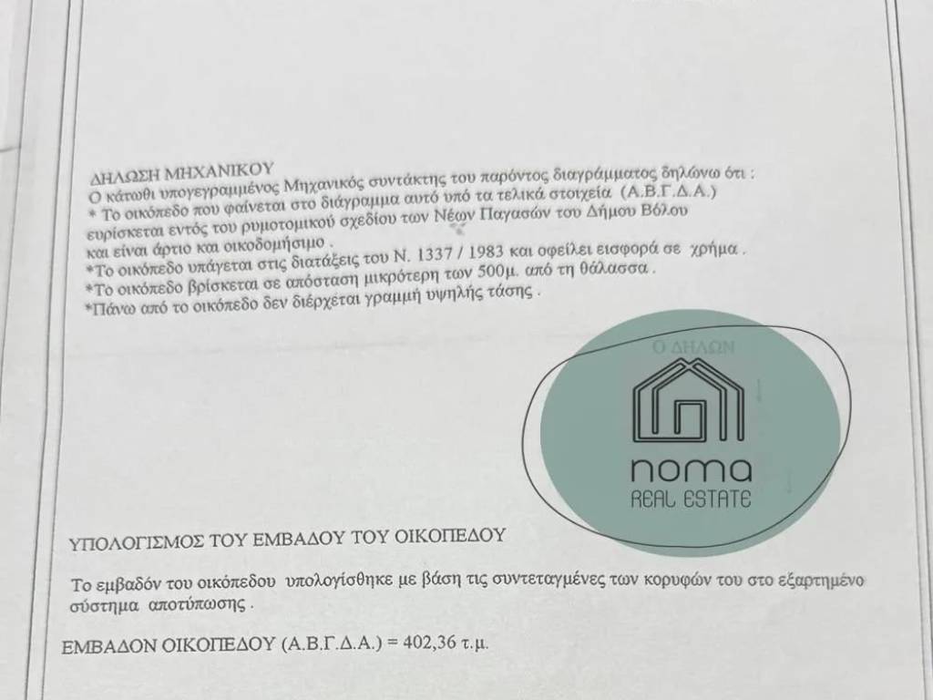 Πωλείται από το μεσιτικό γραφείο Noma οικόπεδο 402,36τ.μ. στο κέντρο στις Νέες Παγασές με θέα στη θάλασσα. Πρόκειται για οικόπεδο με μήκος πρόσοψης 15.66 μέτρα , που δεν το κόβει τίποτα , καθώς απέναντι του είναι αυλή σπιτιού (το σπίτι είναι στο πλάι) και στον επόμενο δρόμο είναι πάρκο του δήμου , με αποτέλεσμα αν χτιστεί κάποια κατοικία στο συγκεκριμένο οικόπεδο να έχει απεριόριστη θέα. Βρίσκεται επίσης πολύ κοντά στο Βόλο. Συντελεστής δόμησης : 0,80 , ποσοστό κάλυψης : 60% , μέγιστο ύψος : 8,50μ. . Συνολικά τ.μ. που μπορούν να χτιστούν στο οικόπεδο είναι 322τ.μ.