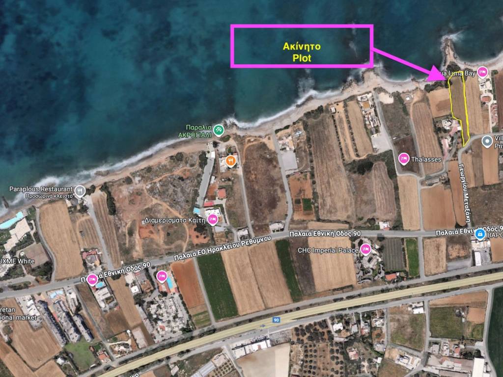 Plot of land of 2208 sq m, even and buildable, in the first coastal zone, within the settlement in Pigianos Kampos. This is a unique property on the beach, in front of a small sandy beach and a peninsula. The rear is facing a street. North orientation with unobstructed views of the sea, due to its prominent position, from East to West. Privileged point of the area with easy access in 15 minutes via VOAK to the city of Rethymno. There are shops nearby and 2 minutes away from the High School/Gymnasium and 4 minutes from the Primary School. Excellent, either for building a residence or multiple houses up to 400 sq m or for a tourist exploitation with a building of 1180 sq m on 2 levels. The public utility networks reach the property. Updated topography is available. Please contact only for serious proposals. Advertisement from the owner.