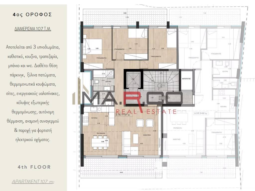 Apartment For sale, floor: 4th, in Kallithea - Lofos Filaretou. The Apartment is 107 sq.m.. It consists of: 3 bedrooms, 1 bathrooms, 1 wc and it also has 1 parkings (1 Underground). The property was built in 2026. Its heating is Personal with Heat pump, Solar water system, Thermal insulation are also available, it has Alluminum, Thermal brake frames with Double glazed - Energy Efficient windows, the energy certificate is: A+ and its floors are Tiles, Wooden. The property's status is: New development, Under construction and it has Southeast orientation and it also has the following unique features and advantages: Window Screens, Elevator, Storage, Security door, CCTV, Security alarm. Price: €395.000. MA.R.CO REALESTATE & CONSTRUCTION, contact phone: 6944855335, 2109650870, email: info@marco-realestate.gr, website: