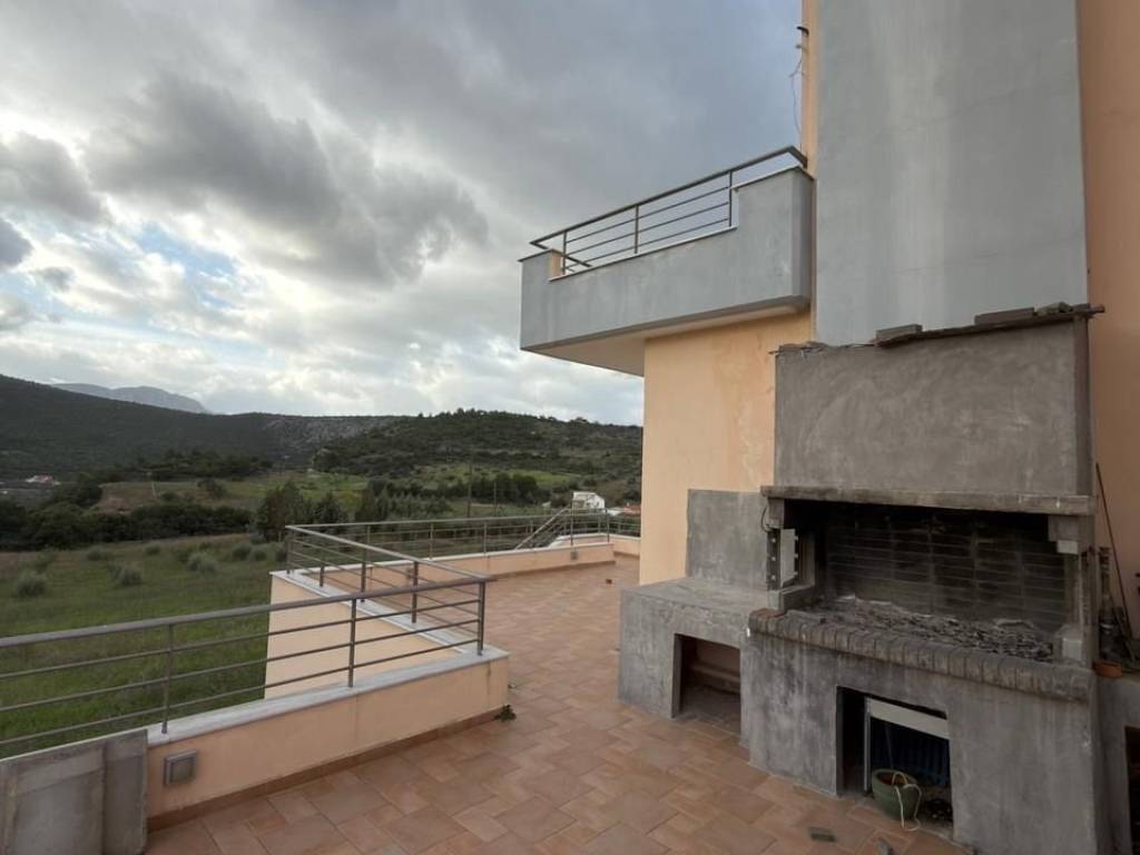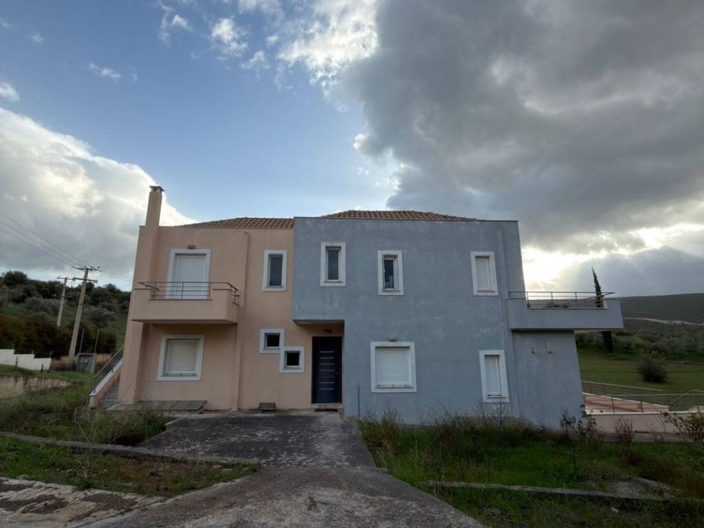 Κατοικία τριών επιπέδων συνολικής επιφάνειας 349 τ.μ., σε αγροτεμάχιο 4.100 τ.μ. Πιο συγκεκριμένα, αποτελείται από: - υπόγειο επιφάνειας 121 τ.μ., εκ των οποίων ±80 τ.μ. έχουν χρήση διαμερίσματος το οποίο περιλαμβάνει ένα κεντρικό χώρο (σαλόνι), μπάνιο, WC, 2 δωμάτια και master υπνοδωμάτιο. Ο υπολοιπόμενος χώρος περιλαμβάνει λεβητοστάσιο, αποθήκη. - ισόγειο & Α' όροφος, συνολικής επιφάνειας 228 τ.μ., τα οποία περιλαμβάνουν σαλόνι με τζάκι και βεράντα, 4 δωμάτια, δύο μπάνια, WC, και master υπνοδωμάτιο. Όλα τα επίπεδα επικοινωνούν με εσωτερικό ασανσέρ και σκάλα. Το ακίνητο επίσης διαθέτει πόρτα ασφαλείας, καινούργια αλουμίνια και ηλεκτρικά ρολά.