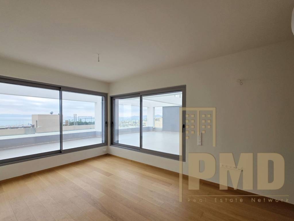 Alimos (Kalamaki), penthouse of 160 sq.m., 6th and 7th floor (attic), 3 bedrooms (potential for 4th bedroom in attic), 2 bathrooms, 1 WC, open plan consisting of kitchen, lounge, energy fireplace and dining area, verandas. Light filled, timber flooring, internal staircase, exclusive use of terrace. Autonomous gas heating, central cooling system, garage space, 1 storage room, electric shutters, security door. Close to public transport, schools, shops and the beach. Sea views.