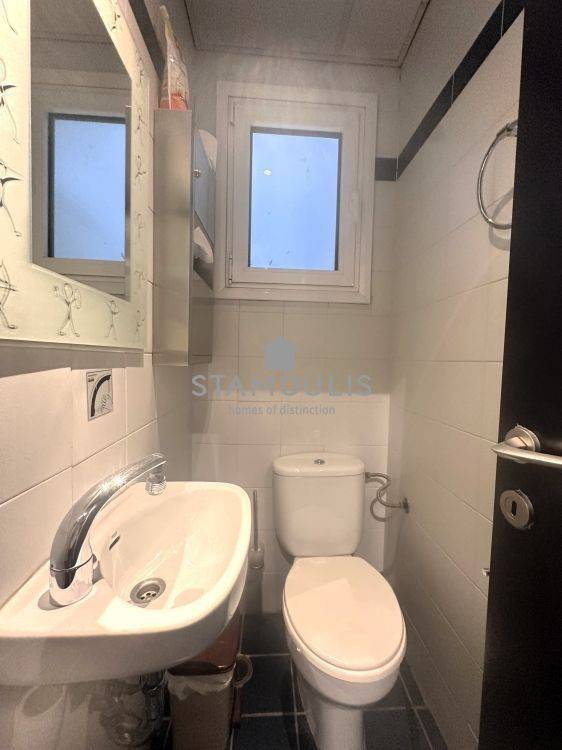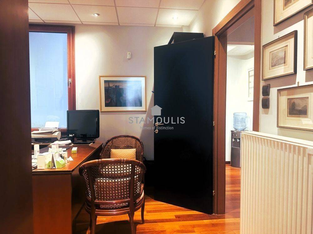 Renovated apartment 100 sq.m, on the 1st floor, used as an office, near Kolonaki Square. It has 2 bedrooms, an office, bathroom, wc, large reception area, storage room in the basement, oak flooring, double glazing, security door, alarm system, air condition and heating with natural gas.