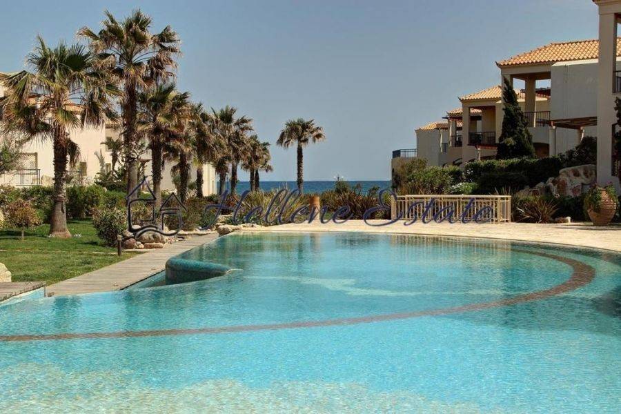 The apartment is located in a beautiful residential complex in front of the sea, with beautiful views to the sunset. The complex has ample parking spaces and a large communal swimming pool and a children's pool. It has gardens with lawns and nice flowers where you can relax and unwind. The property for sale has a private parking space. The house combines modern amenities with the traditional architecture of the island. The house is located on the first floor of a three-level building, where we climb an external staircase. The entrance opens into an open plan living, kitchen and dining area. The kitchen has all the necessary electrical appliances and many cupboards in modern style and colour. A French door leads from the living room to a spacious, covered terrace with unobstructed sea views. From the kitchen there is a hallway that houses cupboard space and laundry area. At the rear are a bathroom with a bath and a bedroom with an exit to a terrace and a large fitted wardrobe. The apartment has air conditioning and modern aluminium frames with screens and double glazing.The total surface / gross area of the property is 80 sq.m.At the front of the complex and parallel to the beach you will find a promenade, ideal for hiking and cycling. There are also hotels, restaurants and cafes along the beach and many quiet spots. The village has a supermarket, petrol station, pharmacy and various services. In the resorts of Platanias and Agia Marina, which are only 10 minutes' drive, you will find all kinds of shops, many services and a beautiful sandy beach, where you can practice water sports. The distance from the city of Chania is about 25 minutes' drive and from the airport 40 minutes.Buying expenses: Theagent's commission from the buyer is 2,5% (+ vat ) on the final purchase price. Issuer ofthe invoice is G.-Alexandros Papadakis, licensed estate agent withGeneral Commercial Registry Νumber 163982258000. Taxes, Lawyer, notary and registry fees must be paid by thepurchaser.