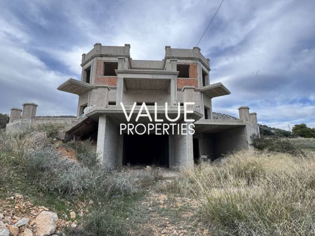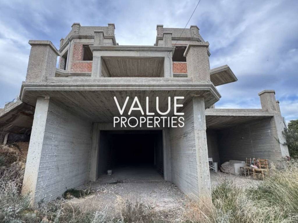 Salamina, unfinished three-level building (basement, ground floor, first floor) with a total area of 645 sq.m., built in 2009 with a completion rate of 60%. It consists of a basement including 3 parking spaces and 8 auxiliary rooms, a ground floor comprising a bedroom, kitchen, living room, bathroom and storage space, and a first floor comprising 4 bedrooms, living room with kitchen, bathroom, WC, dressing room and office space. The property is front-facing, bright and dual-aspect, suitable for use as a holiday home. It is located in a quiet area, close to the sea, with unobstructed views. VALUE Properties, contact phone: 2103004430, email: info@valueproperties.gr, website: https://www.valueproperties.gr