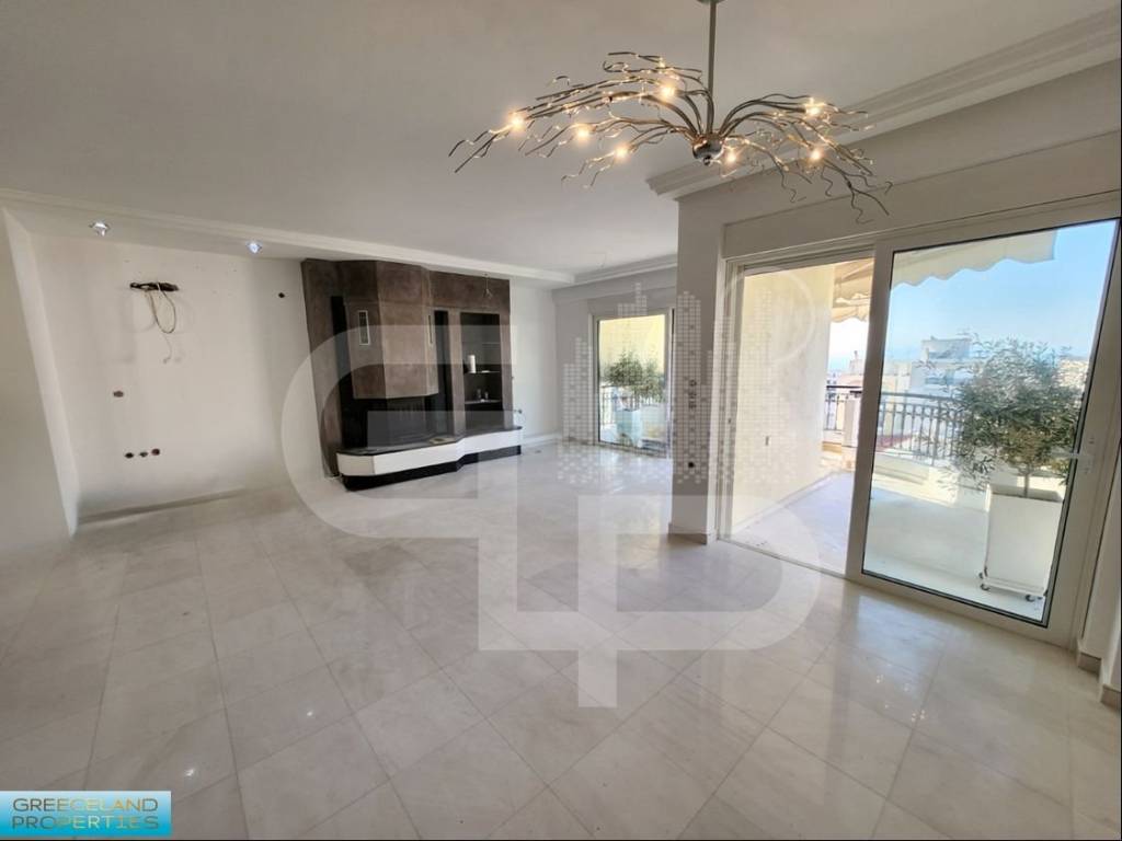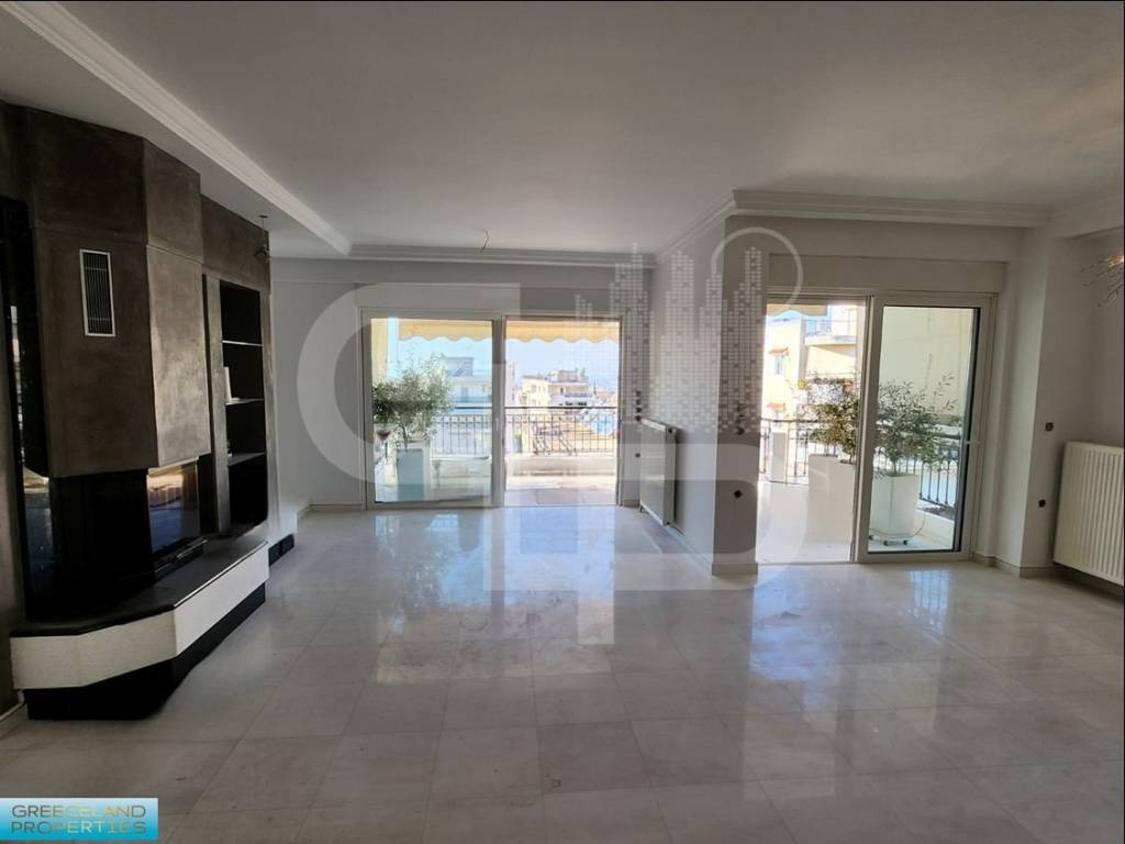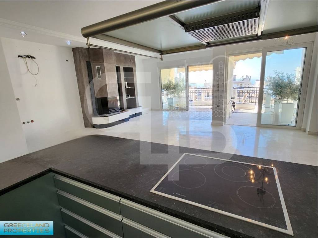 ANO GLYFADA–TERPSITHEA, Luxurious penthouse/4th-floor apartment of 121sq.mt. constr.2007, sunny, airy, with exclusive use of apprx.60sq.mt. of top-terrace with barbeque and views at the sea and the hills. It consists of large open living-area with fireplace and comfy, functional, modern kitchen equipped with free counters and lots of cupboards with built-in appliances. It also incorporates: 2 bedrooms of which a spacious master bedroom of apprx. 25sq.mt. , a bathroom with jacuzzi and a WC. Other features : white-marble floorings at the living area and the verandas, black-granite fireplace and counters, wooden/oak floorings at the bedroom, aluminium frames with double-glazed windows, double ceilings with hidden lightning, elevator, security-door, alarm-system, two basement parking spots and two storage-rooms. It is situated in an upgraded, low-traffic residential neighbourhood, with lots of luxurious new-builts. Excellent investment! GREECELAND PROPERTIES, tel. +30 6932 639563 email : info@greecelandproperties.gr