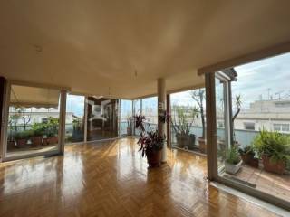 The property features three spacious bedrooms, a comfortable living room, a kitchen with built-in electric appliances, two bathrooms, a WC, a loft, and impressive terraces ideal for relaxation or entertaining.