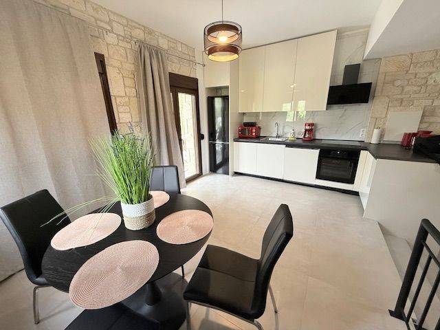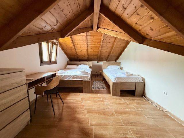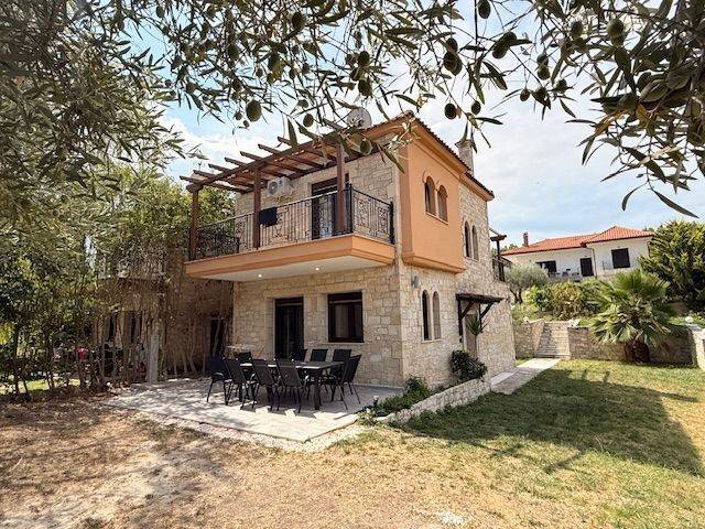 For sale we have a semi detached house in Halkidiki, partly dressed with the stone, build in the tradition of northern Greece architecture with a lot of beautiful details. The place where the villas are built is unique - there used to be a Russian monastery here. Here you can relax in the bosom of nature in peace and quiet from the bustle of the world, walk along the pinetree forest and enjoy the silence and contemplation of nature. A wonderful view of the sea opens from the terraces and balconies. On the other side there is a view of pine-covered mountains and olive groves. On the ground floor there is a spacious living room with a fireplace combined with a dining room and a kitchen with built-in furniture. Also, we have a toilet. On the upper floor there are 2 cozy bedrooms with the exit to the balconies and a bathroom with a bathtub and a toilet. Both bedrooms have exit to a balcony. Finally in the attic there is a bedroom loft that will be nice escape for the kids and teens. Excellent condition of the property Good quality materials and construction Furnished and equipped in 2025 Partly stoned All the electric appliances of the kitchen Air conditions in all spaces Pre installation for individual heating system (boiler and radiators – oil fired) Solar panel Nice shape of the garden with possibility to build pool Parking places Panoramic sea view Quite place – pine trees forest surrounded Infrastructure in 5 min. drive Nice sandy beach in 5 min. drive 1 hour drive from the International Airport of Thessaloniki