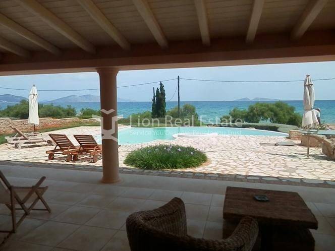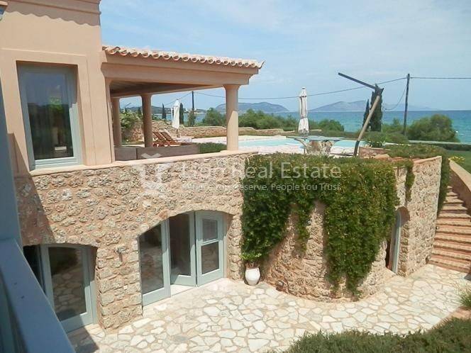 Newly built maisonette, in Porto Heli - Petrothalassa 300sqm on a plot of 2 acres, right in front of the beach with unlimited views of the sea and Hydra. It has a private pool with a sea view and a separate hydromassage. The residence consists of: 1st floor: living room, dining room, living room with fireplace, kitchen, bedroom with wardrobes and its own bathroom each with bathtub and hydromassage, wc, 50 sq m tiled terraces. Ground floor: playroom, wc, storage room, 2 bedrooms with their own bathroom, bar, independent guest house with kitchen and bathroom. Additionally outside there are: water tank, swimming pool 60m2 with hydromassage, pool engine room and storage, pool tank, Garage 50m2, outside bar and living room with pergolas built with stone, BBQ and fully functioning grill with motor etc., a stone storage room next to the kitchen and the rotisserie. The surrounding area has plants in stone flower beds. • The house is built with very strong foundations, reinforced with soil remediation at a depth of two (2) meters. The entire frame has been constructed with an exaggeration of iron placement and reinforced concrete. The walls have been built with bricks on both sides and waterproofing in the middle. The ground floor has a stone lining, and after the stone, cement mortars and waterproofing have been made. Perfect thermal insulation.