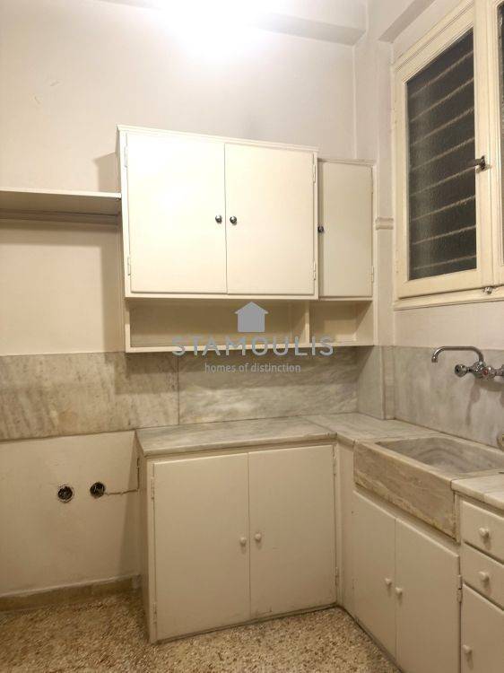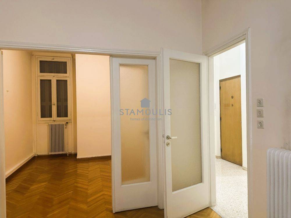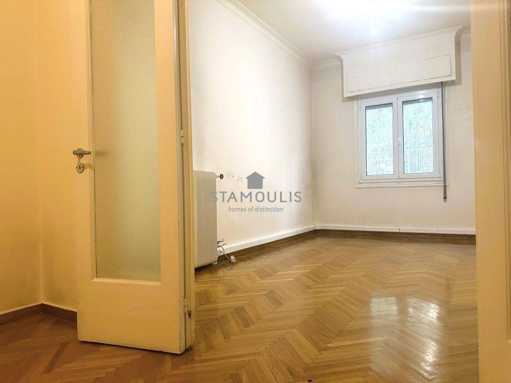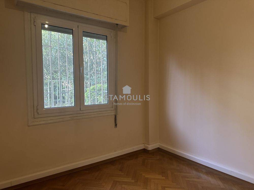 Corner ground floor apartment of 67 sq.m, on Gennadiou Street. It has three spaces, hallway, separate kitchen, bathroom, wood striped floors and heating with natural gas.