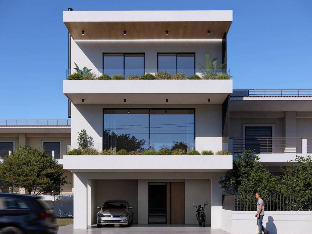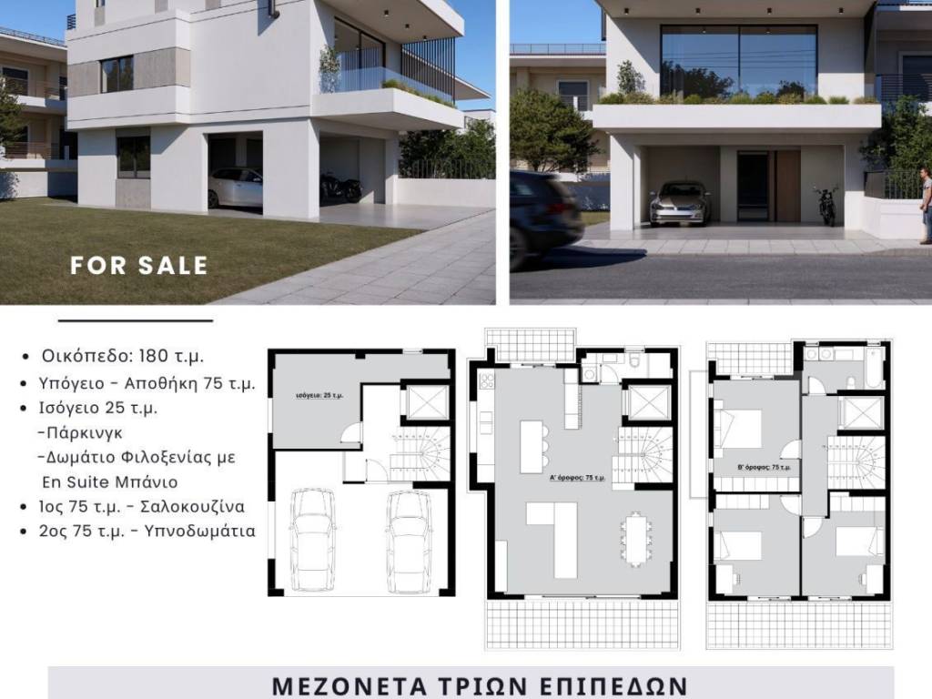 For sale is a modern three-level maisonette on a plot of 180 sq.m., with a functional layout and ideal coverage of family needs. The rooms in detail: • Basement: Storage room 75 sq.m. • Ground floor: 25 sq.m., with • parking space (2 spaces) • guest room with en suite bathroom • First floor: 75 sq.m., open plan living room - kitchen • Second floor: 75 sq.m., with 3 bedrooms The property has 3 bathrooms (one on each level) and large balconies with modern architectural aesthetics. Features: • Three-level maisonette • 3 bedrooms • 3 bathrooms • 2 parking spaces in the pilot house • FAN COIL •. Modern design & clean lines • Energy class A+ •. Total alarm/thermal facade/video door entry/electrical systems •. Ideal for home ownership Price: 550,000€