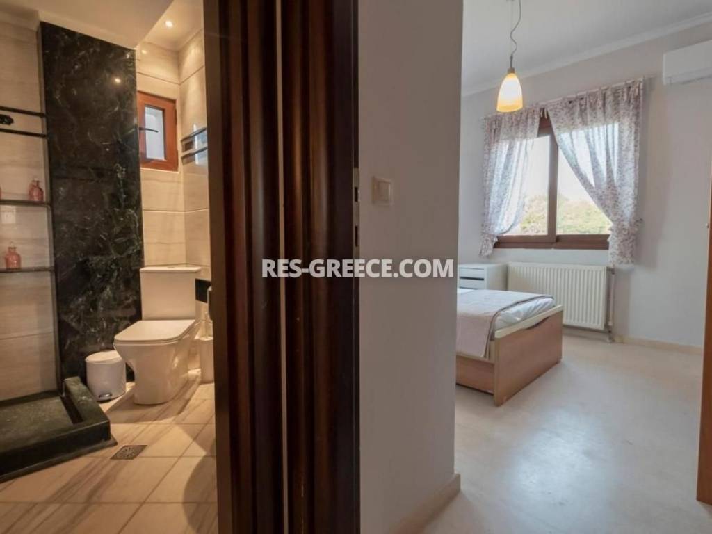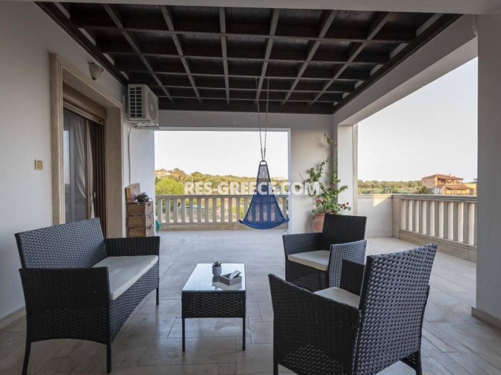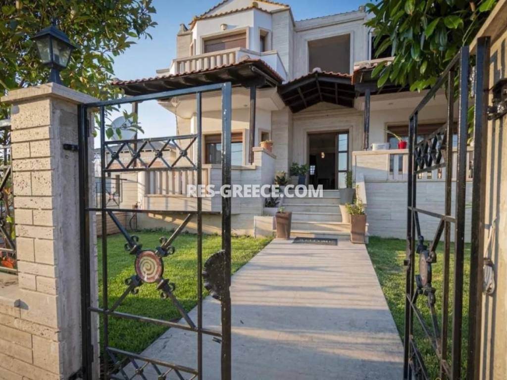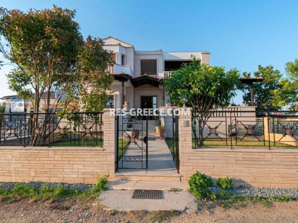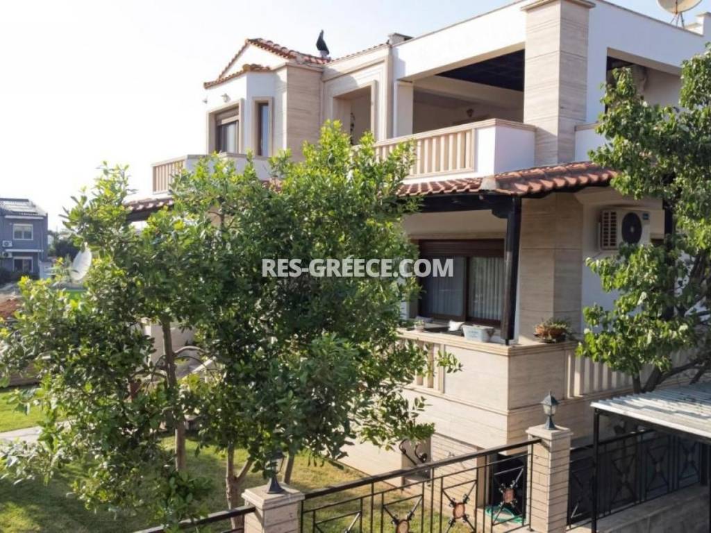For sale there is the big family villa of 240m2 close to the town and the beach (500m) that can be used for both vacation and permanent living. on the Ground level (of 140m2) there are 2 living rooms, a fireplace, a sitting room and a kitchen, a guest’s room plus a shower and a small store room under the stairs. On the first level (of 100m2) there are 2 rooms, a master bedroom with private cloak room and shower and also we have a big bathroom with hydro massage and 2 sinks. The first level is “facing” to a huge covered veranda. High quality construction Including all the furniture, lighting and home appliances (like Aeg oven and Samsung refrigerator). 3 wardrobes totally in the bedrooms Individual heating system (boiler and batteries) 2 air conditions (18.000 & 12.000 Btu) Alarm system Satellite antenna Dressed with marble and granite (totally almost 600m2) 60m2 underground boiler/storage room. Sunset view Infrastructure nearby 30min from the airport Garden possibility to build small pool Construction ended at the end of 2005