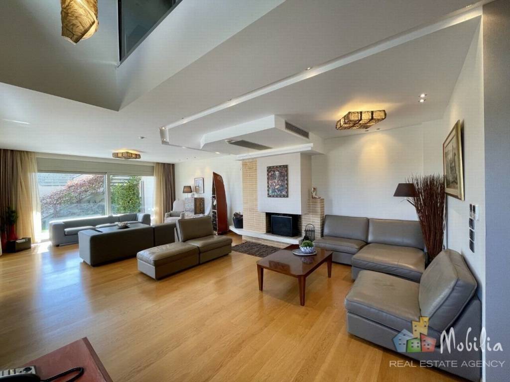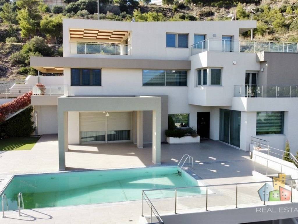Luxurious contemporary house in minimalist style, built in 2013, on a plot of 1250 sqm in the residential area of Drafi. Available from July 2026. Located in beautiful natural surroundings, 25 minutes’ drive from Athens, 20 minutes from the international airport and beaches and close to international schools, the Attica motorway and the metro to Pallini. You will appreciate its panoramic view to the sea, its swimming pool on the level of the living room , the barbecue area and its independent guest apartment. This property has exterior thermal insulation, triple glazing of heavy and anti-spherical type, an alarm system with outside line and cameras connected to a smart TV, internet modems on each floor, a generator current with external line, VRV air conditioning, underfloor heating by zone, fire detection system. The main house of 300 sqm. includes a living room naturally lit by a glass roof, a separate dining room, a separate kitchen, a master bedroom with its bathroom and dressing room, two children's bedrooms, another bathroom, a large office opening onto a terrace and a laundry room. On the lower level there is the garage for 3 cars, two large storage spaces and the independent apartment of 88 sqm., connected to the main house by an interior staircase and by the elevator.