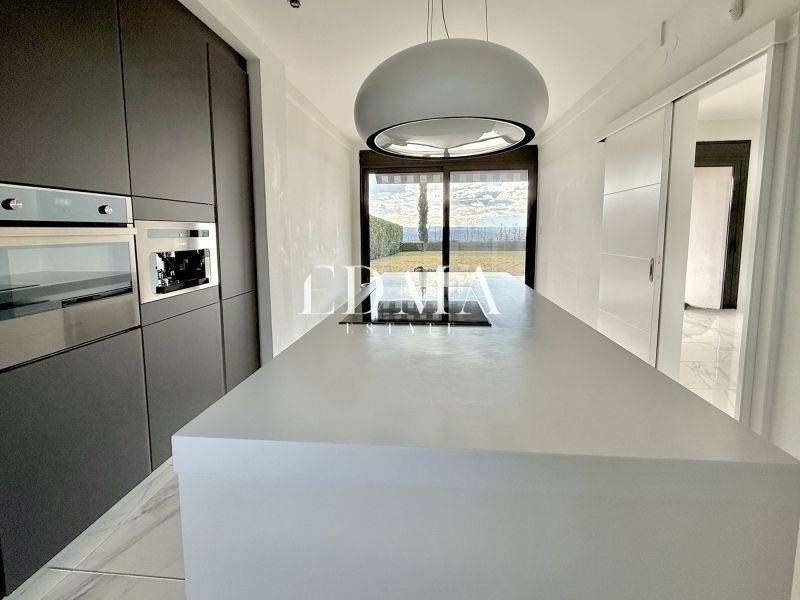 The thoughtfully designed layout includes five generously sized bedrooms, four bathrooms, and an additional guest WC. The main kitchen features sleek modern design, premium finishes, and clean architectural lines, while a second kitchen with a laundry area on the lower level adds flexibility and practicality.