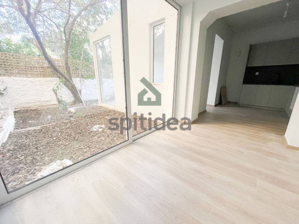 This is a fully renovated apartment with a total area of 88 sq m on the ground floor of a building built in 1970. It consists of a comfortable living room divided into 2 parts (one can be used as a dining room or office space), an independent kitchen, 2 spacious bedrooms with built-in wardrobes and a bathroom (loft above). It has new plumbing and electrical installations, a security door, autonomous heating with a heat pump, aluminum frames with double glazing, pre-installation for an alarm, and there is also a storage room. It is bright with its own courtyard at the back and a comfortable balcony in front. It is located in an excellent location in a quiet neighborhood, with direct access to Attiki Odos, while the tram station is very close by.